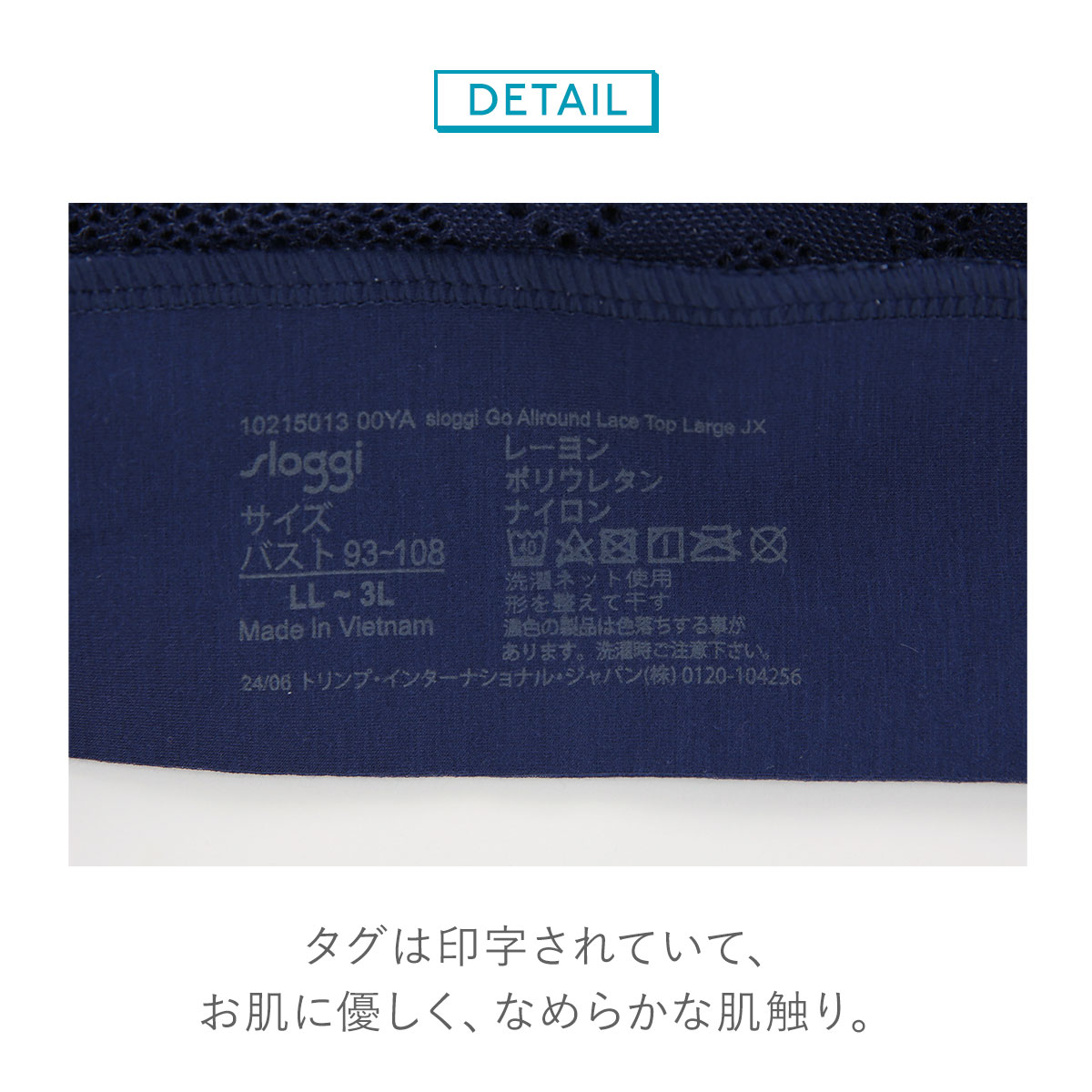 アンダーバストには、肌触りがなめらかなレーヨン混素材を使用。パッドが身生地と一体化し、安定感のある着けごこちのノンワイヤーブラです。