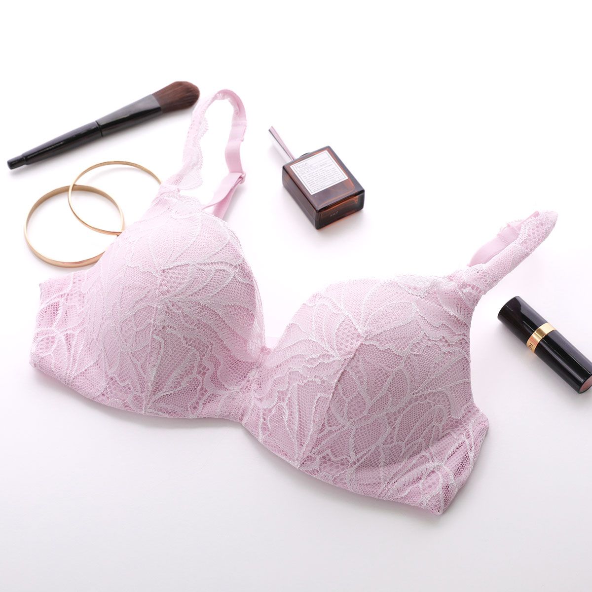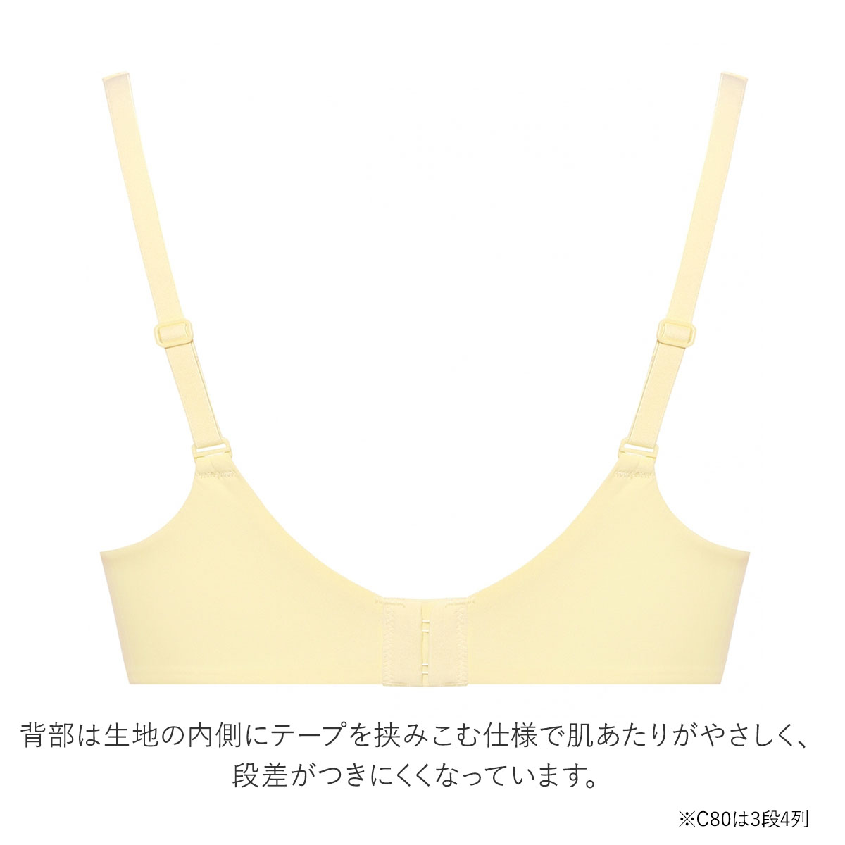 カップは圧着加工により、上辺にかけて薄くなっているため、より肌になじみやすく、カップ上辺の浮きを軽減します。通常のワイヤーよりしなやかで細い新開発のソフトワイヤー『コンフォート・ワイヤー(R)』を使用しています。ワイヤーチャネル部分は身生地と同素材を使用し、段差が少ないフラット構造なので、ワイヤーの圧迫感を感じにくく、ここちよいです。