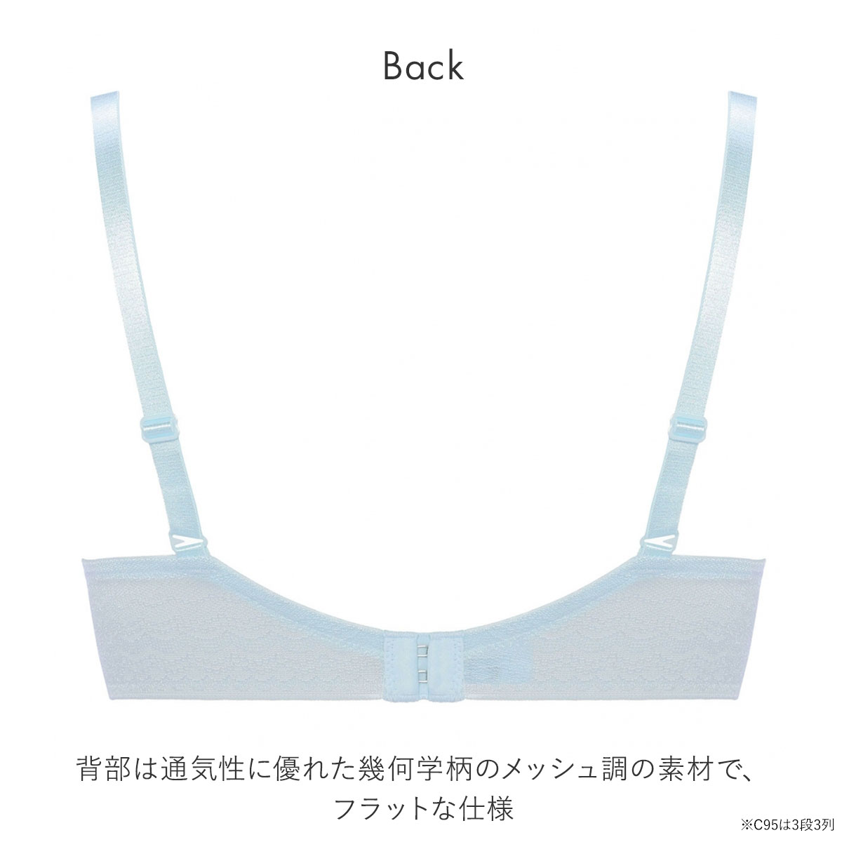 外側と肌側で硬さの異なる二層構造の素材、「エンジェルスリムシート(R)」をカップサイドに使用。バストの横広がりを防いで、すっきりと見せます。通気性の良い、「エンジェルさらスルーカップ(R)」で、軽く、着けごこちサラサラ。パッドポケットは速乾性に優れた素材を使用しています。背部は通気性に優れた幾何学柄のメッシュ調の素材で、フラットな仕様なので、くいこみにくく、アウターにひびきにくくなっています。フロント中心部のワイヤーを薄くフラットにし、外側に反らせた「NEWエンジェルワイヤー(R)」を使用。肌にくいこみにくく、痛くなりにくくなっています。ファイバーフィルパッドで、バストボリュームアップ!ストラップにアジャスターがついているので長さの調節が可能です(付け替え不可)。ストラップとめ具に三角形の特殊な形をした「デルタマジック(R)」を使用しているので、肩からずれ落ちにくくなっています。