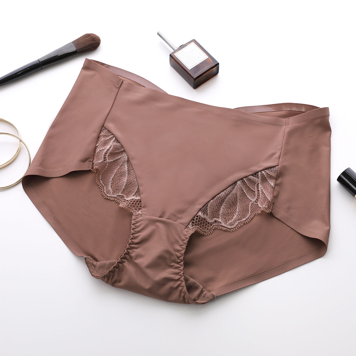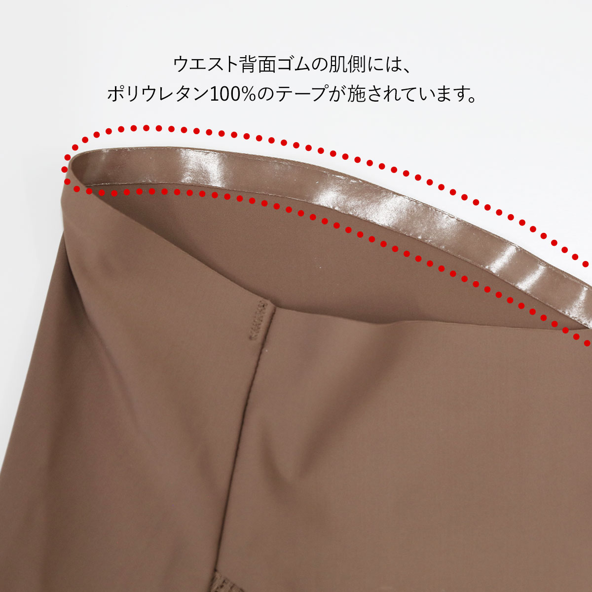 身生地にはなめらかで伸縮性のある吸水速乾性を持つ素材を使用しています。後ろ脚口は身生地の折り返しとボンディング仕様のため、くいこみにくく、更にアウターにひびきにくくなっています。前脚口はレース仕様で、くいこみにくくなっています。バックラインはハート型の丸いカーブが腰をしっかり覆います。