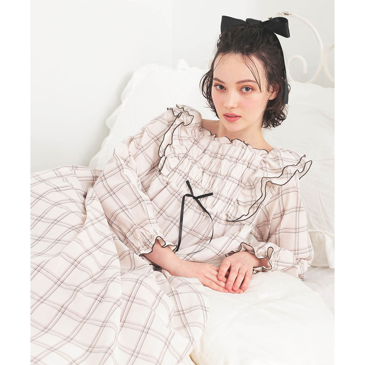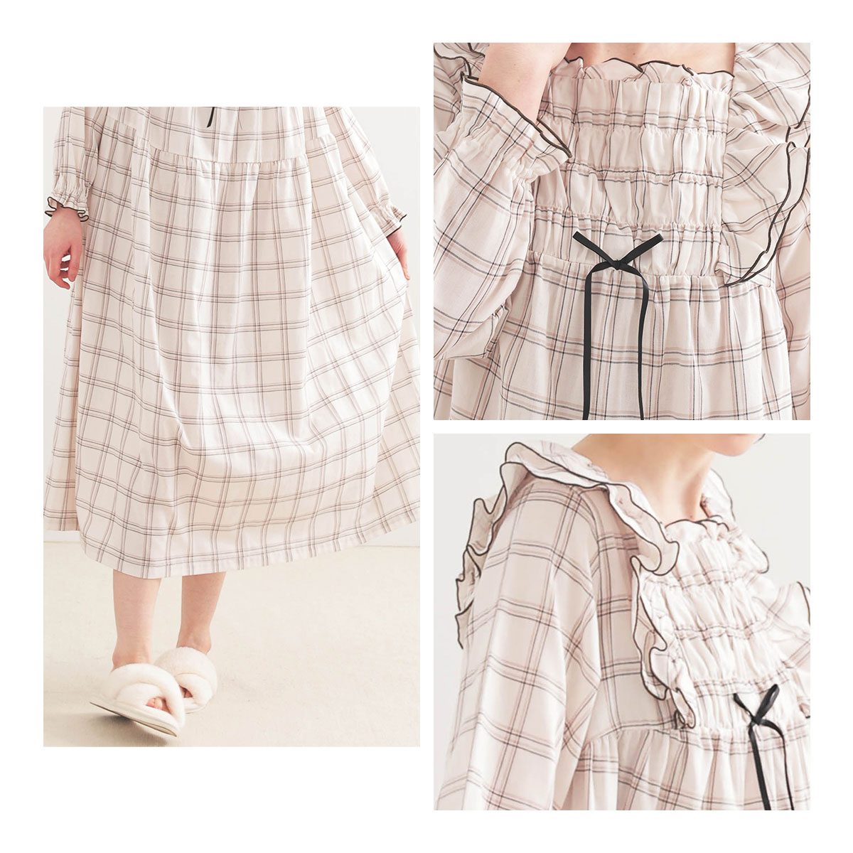ギャザーやメロウのアクセントを付けたフリルで可愛らしく仕上げたチェック柄ワンピース。