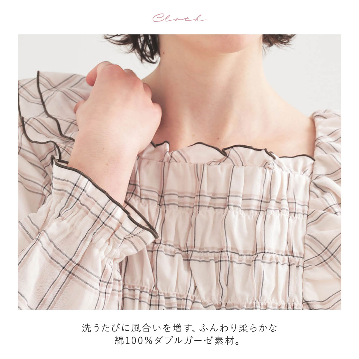 身生地は、洗うたびに風合いを増す、ふんわり柔らかな綿100%ダブルガーゼ素材。繊細な糸で織り上げているので軽やかで、生地表面には上質な光沢感があります。通気性、吸水・吸湿性にも優れ、いつでも着心地快適です。