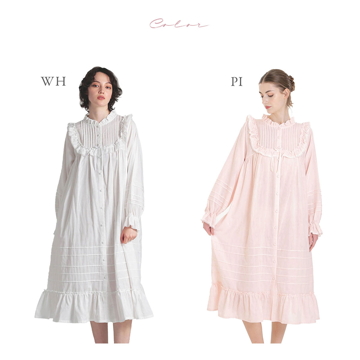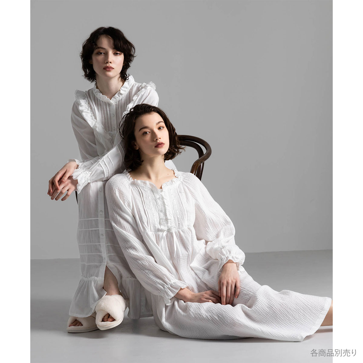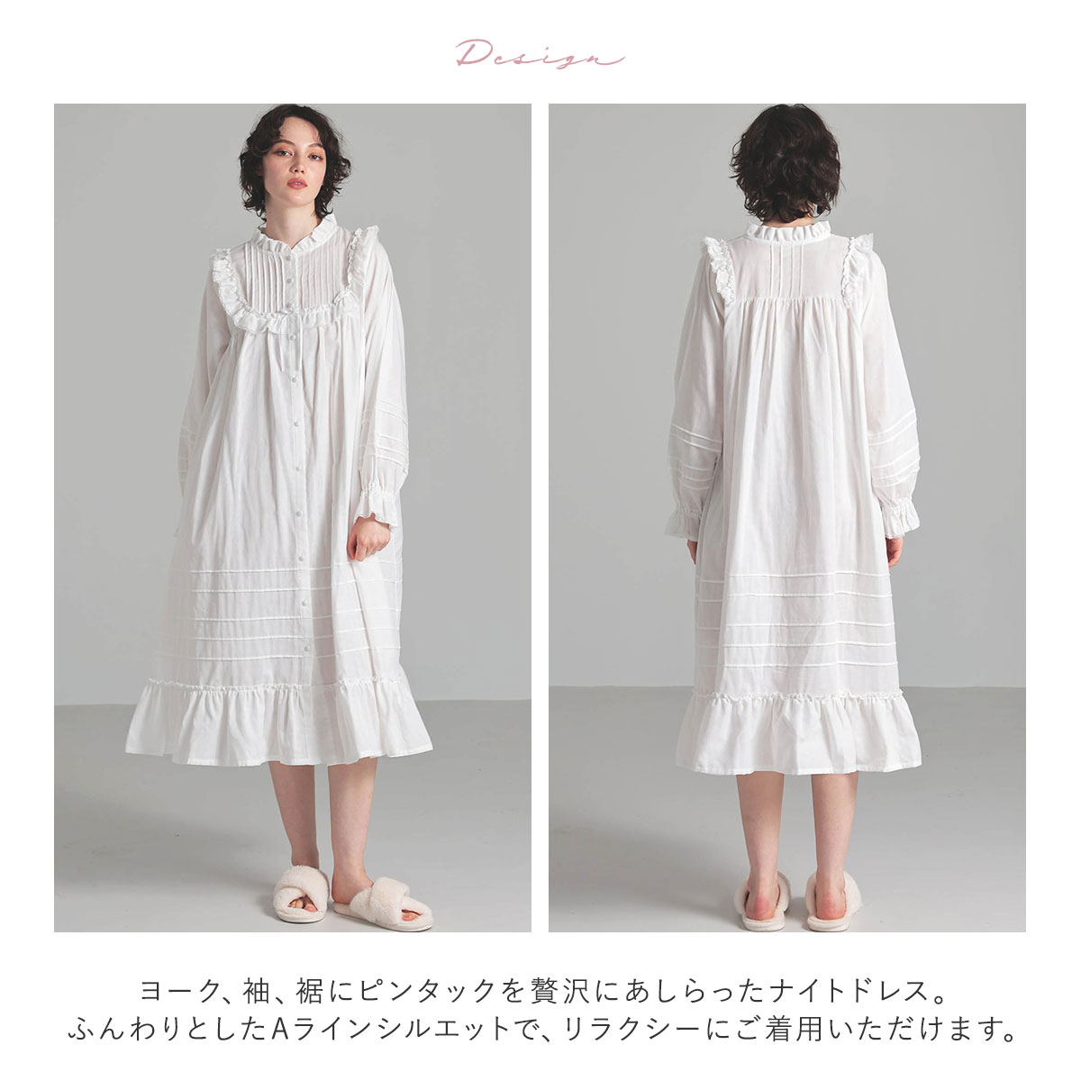 こちらは、ヨーク、袖、裾にピンタックを贅沢にあしらったナイトドレス。細幅のピンタックでクラシカルな印象を与えつつも、裏側はフラットで凸凹感が気にならない仕様になっています。