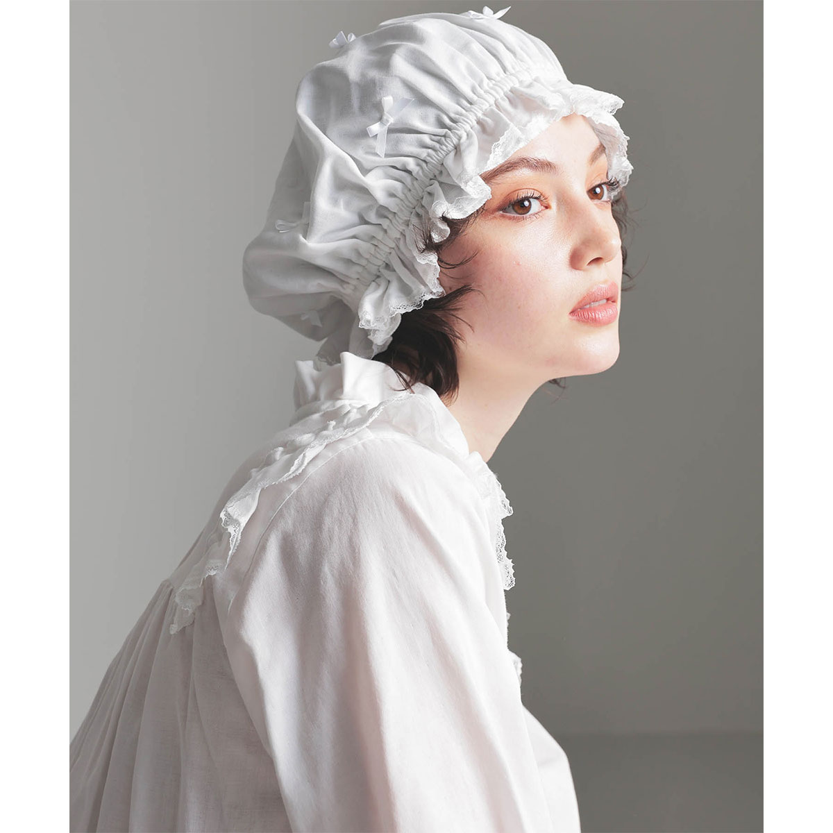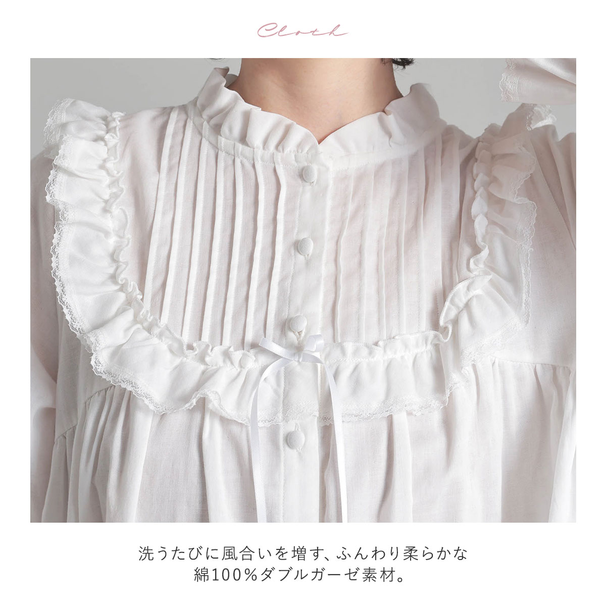 襟周りはフリルで上品な印象に。縫い代を共布で包み、肌あたりに考慮しています。ボタンは、ころんとした丸みのあるフォルムで可愛らしいくるみボタンを採用。フリル端と袖口には軽やかなレースをあしらい、華やかな印象に仕上げています。
