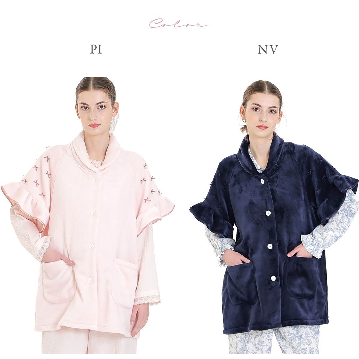 パイピングをあしらったフリルが可愛いスリーブデザインで、肩にはミニリボンが散りばめられています。