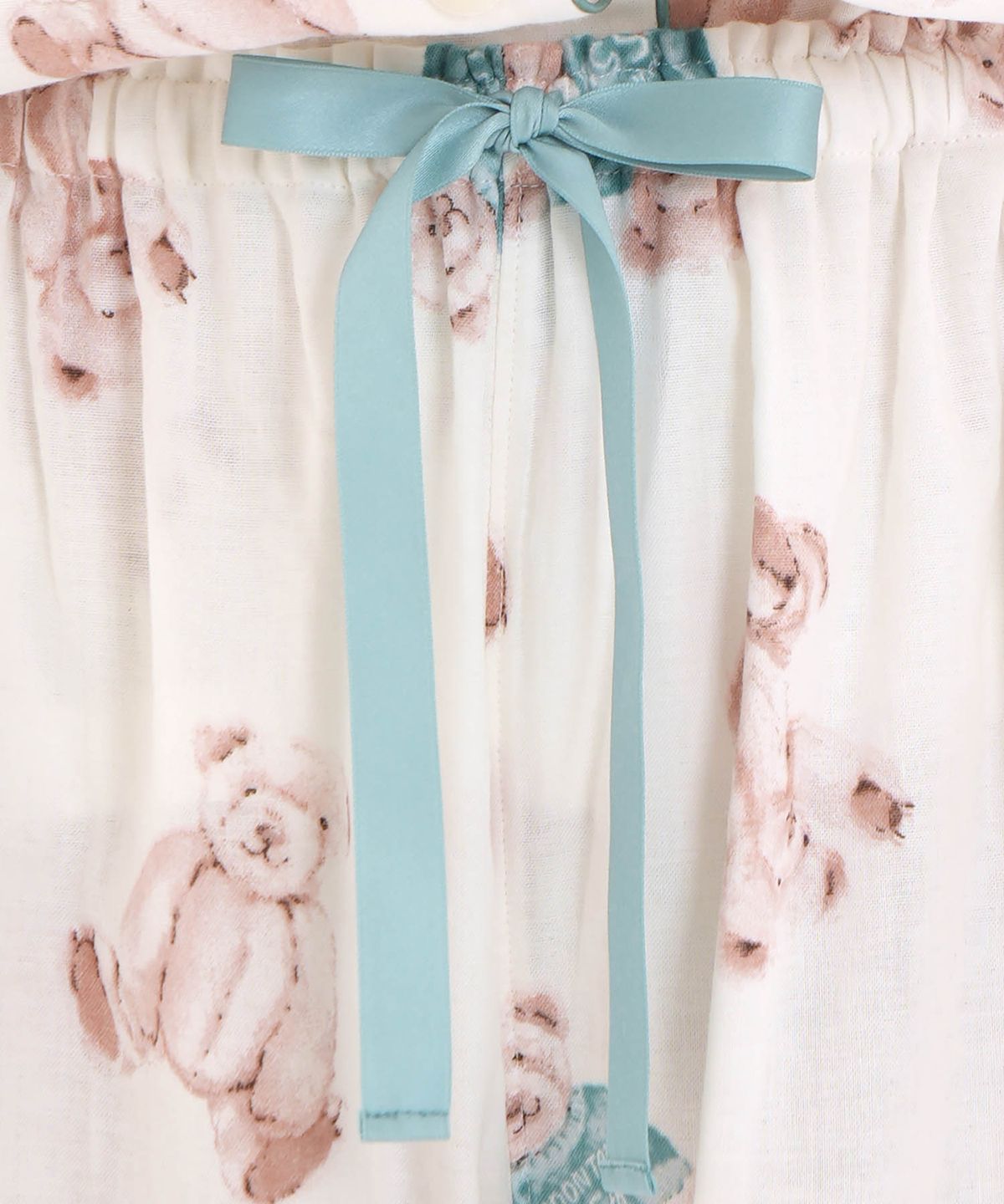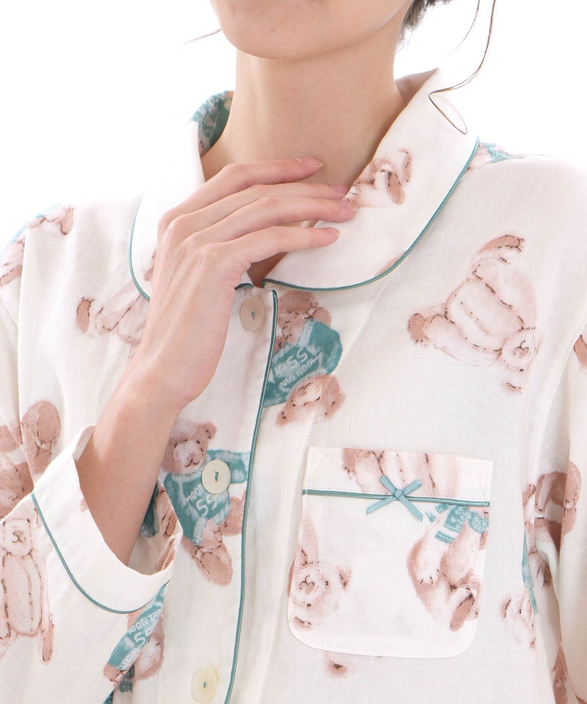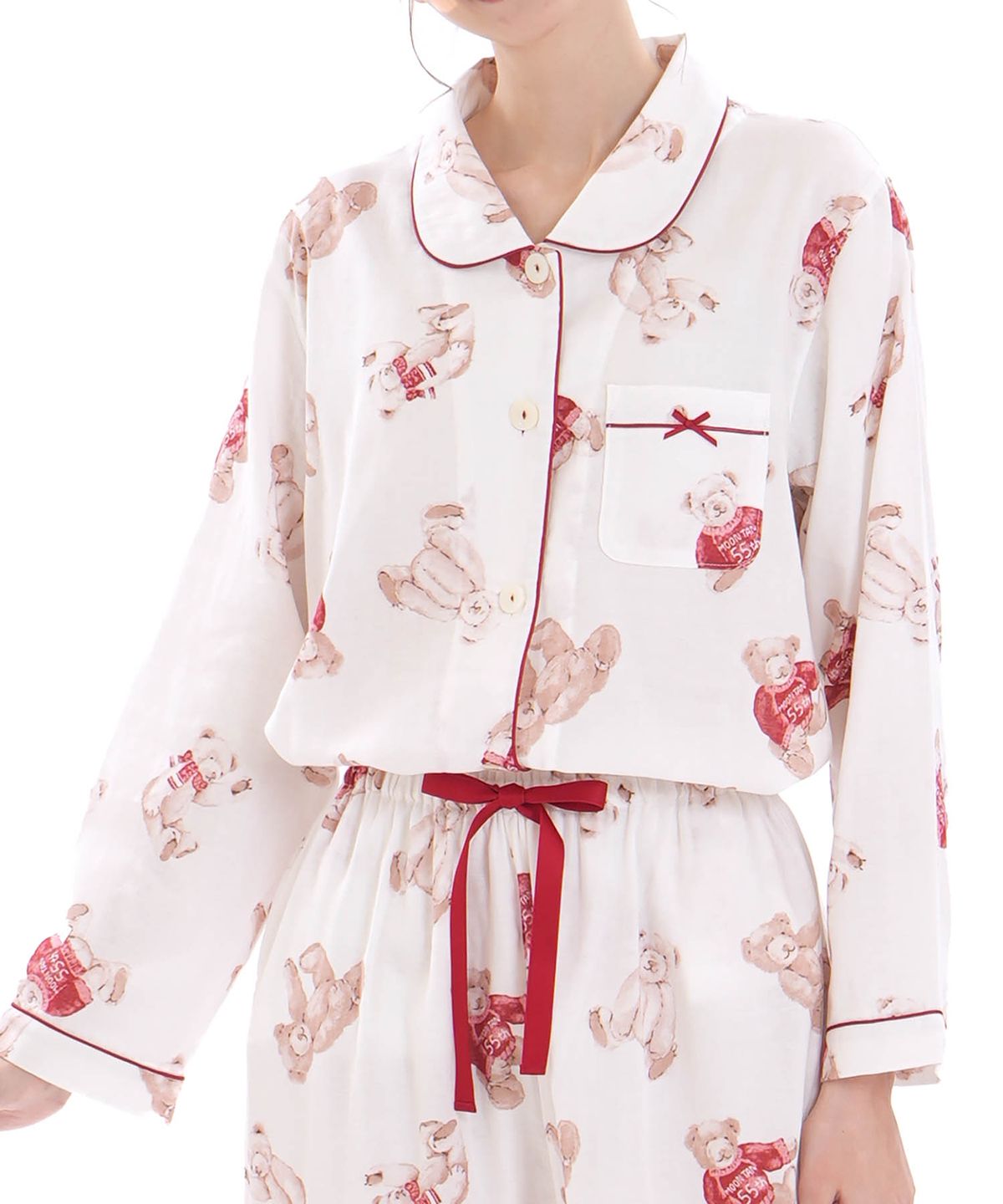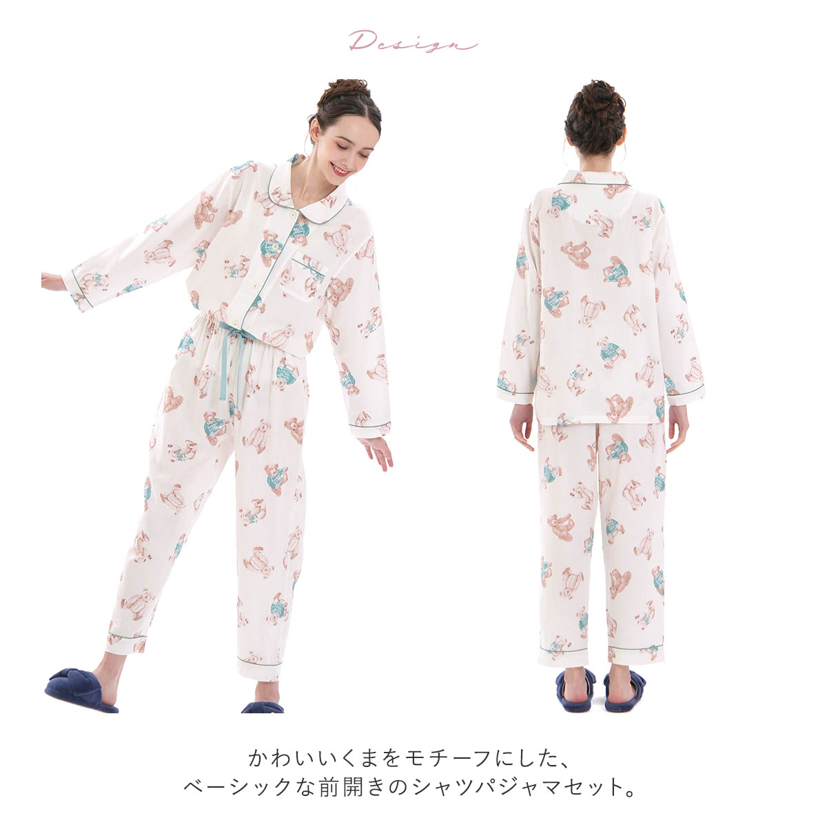 かわいいくまをモチーフにした、ベーシックな前開きのシャツパジャマセット。