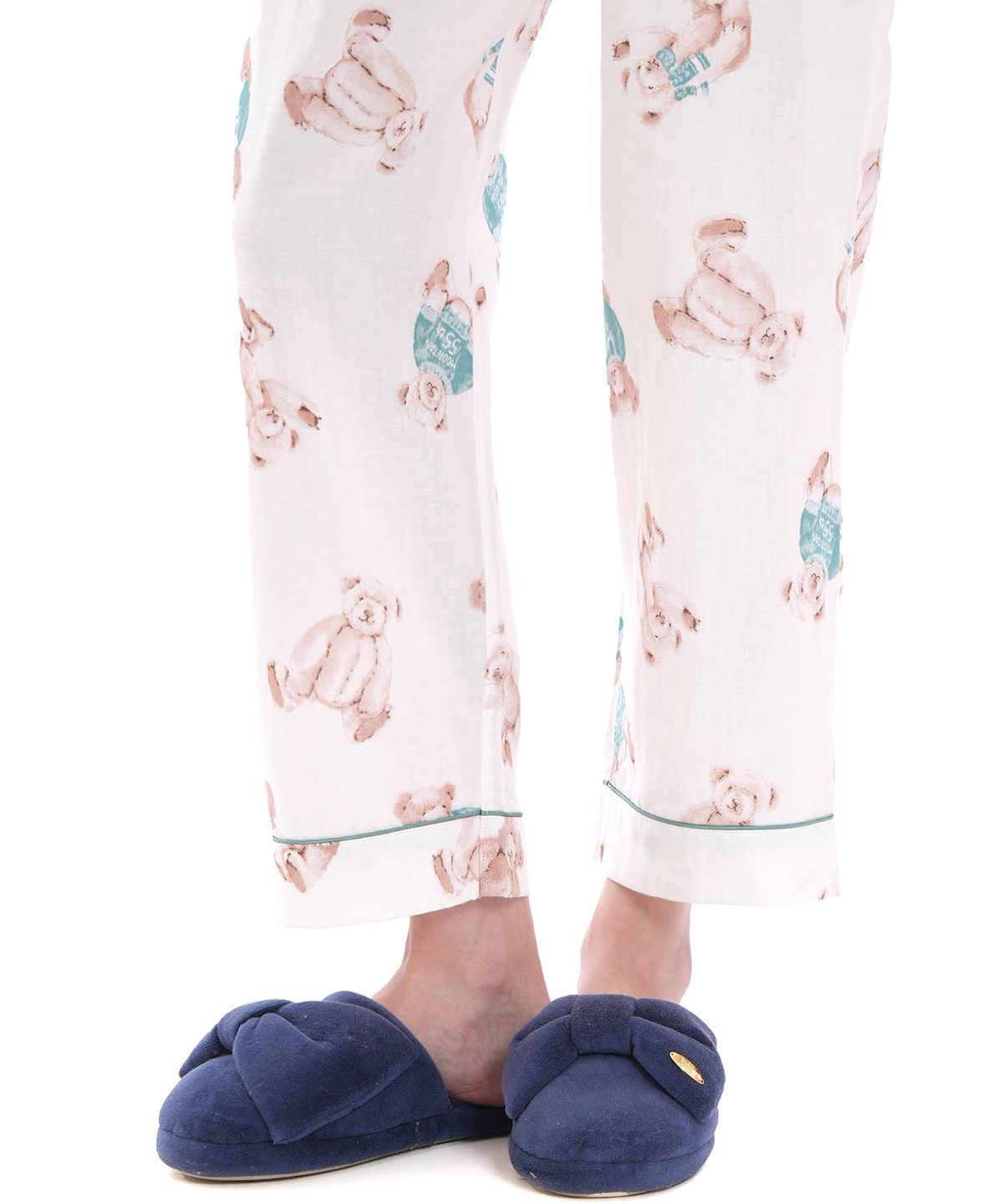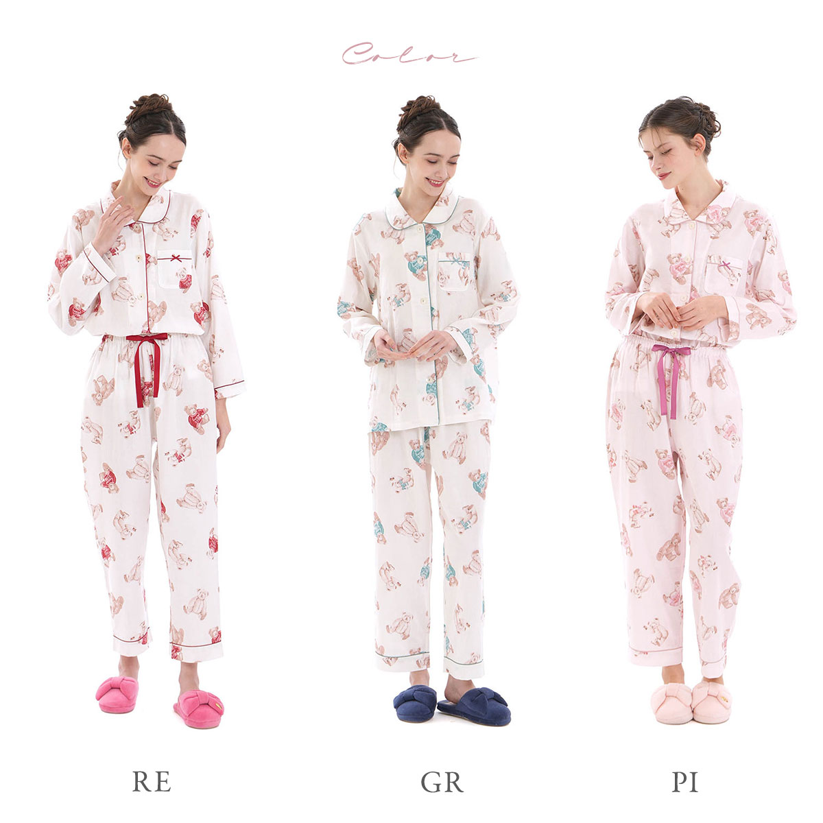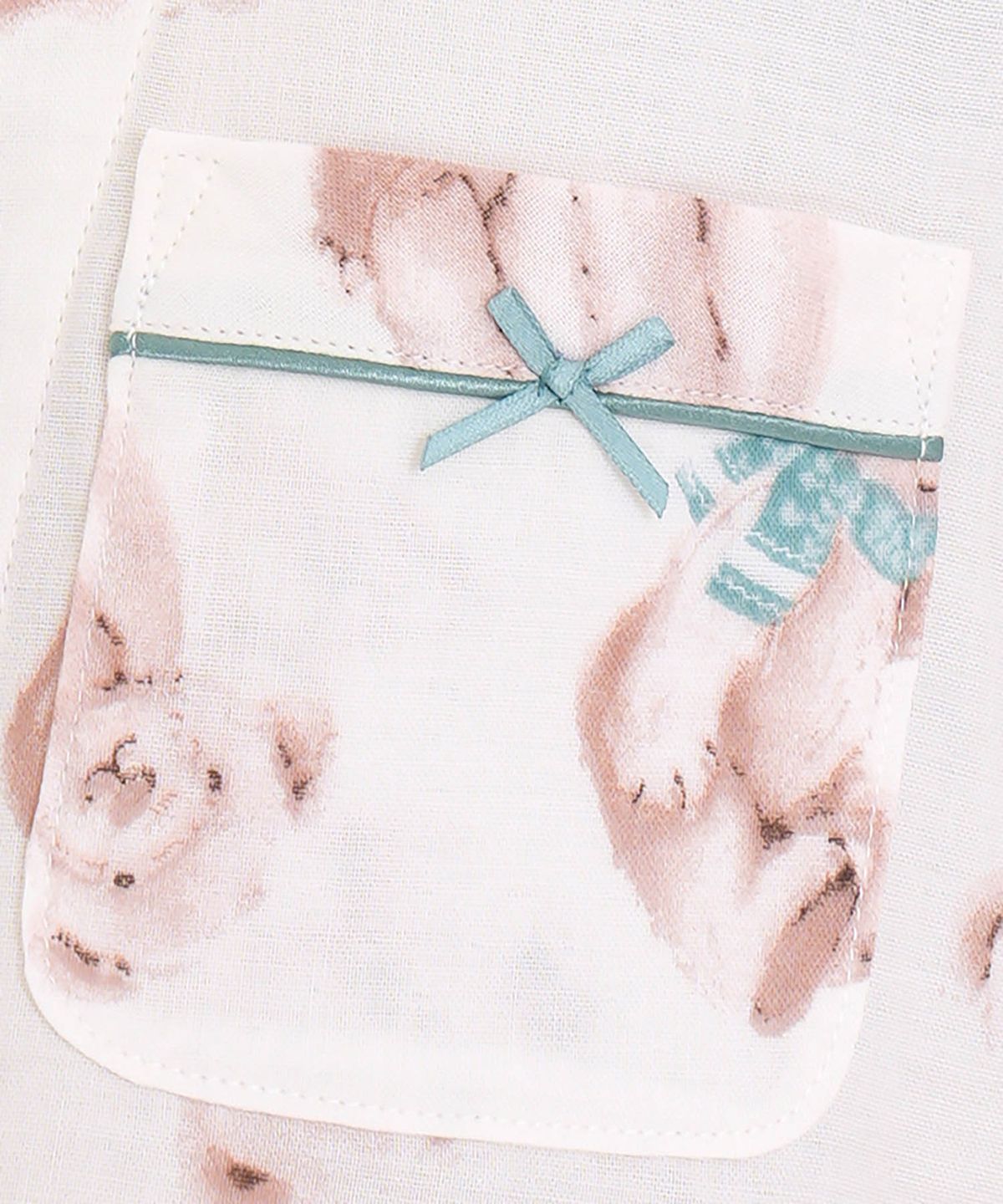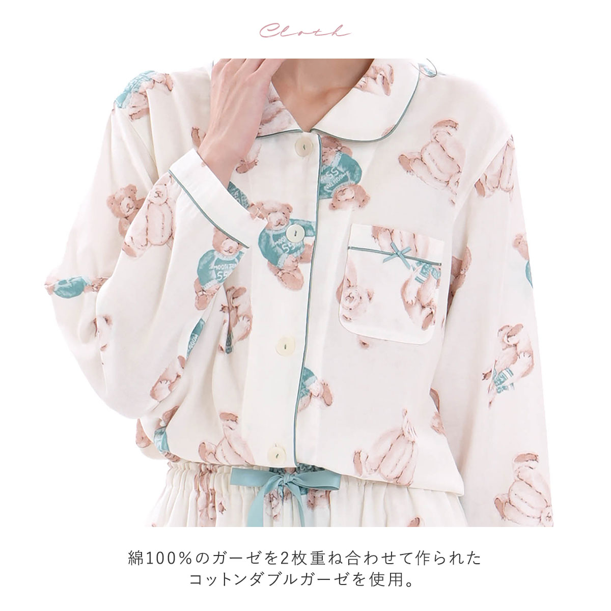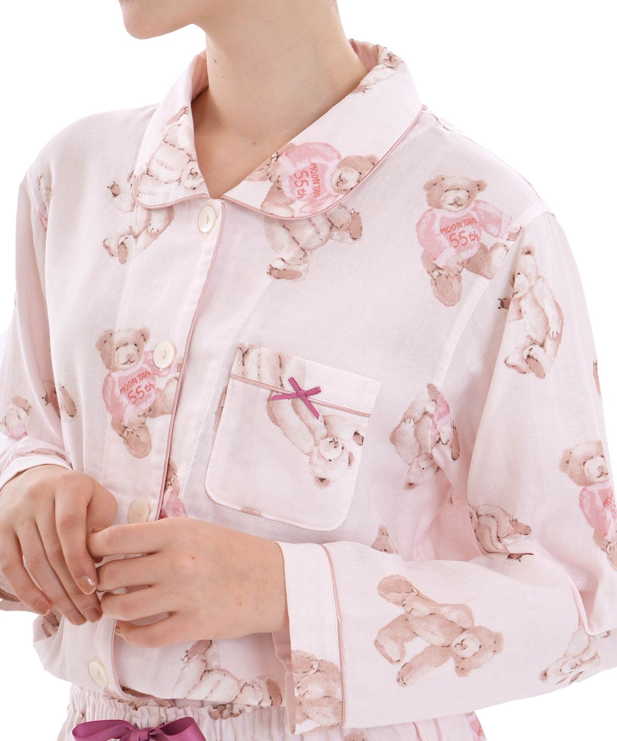 かわいいくまをモチーフにした、ベーシックな前開きのシャツパジャマセット。