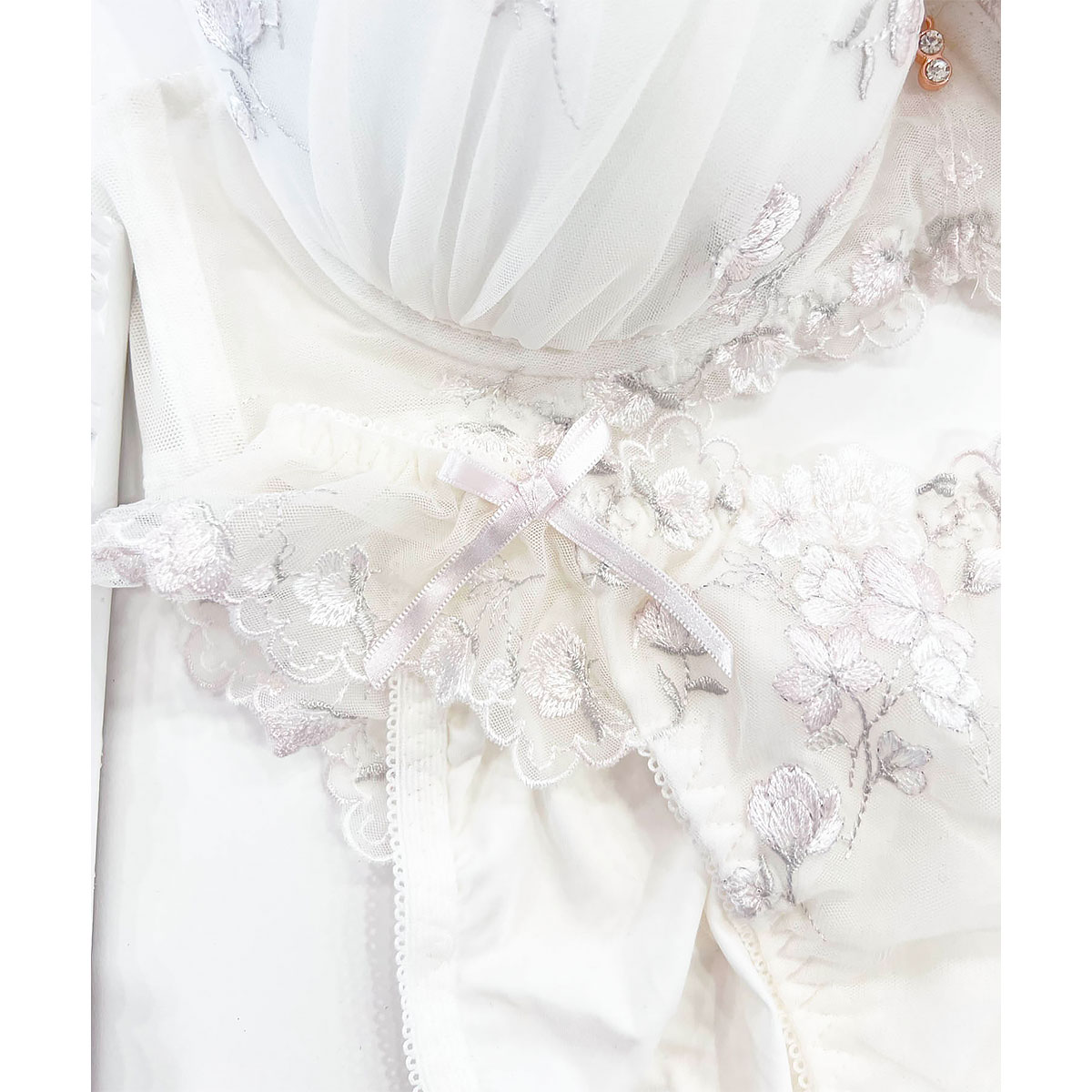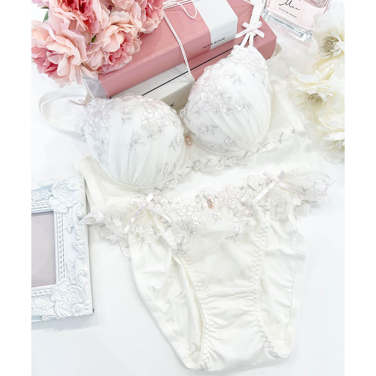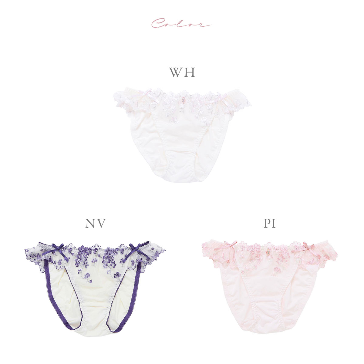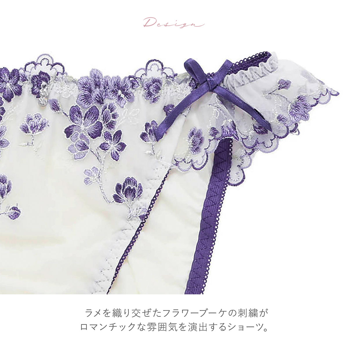 ラメを織り交ぜたフラワーブーケの刺繍がロマンチックな雰囲気を演出するショーツ。サイドはセット柄レースのフリルをあしらい、より華やかに。