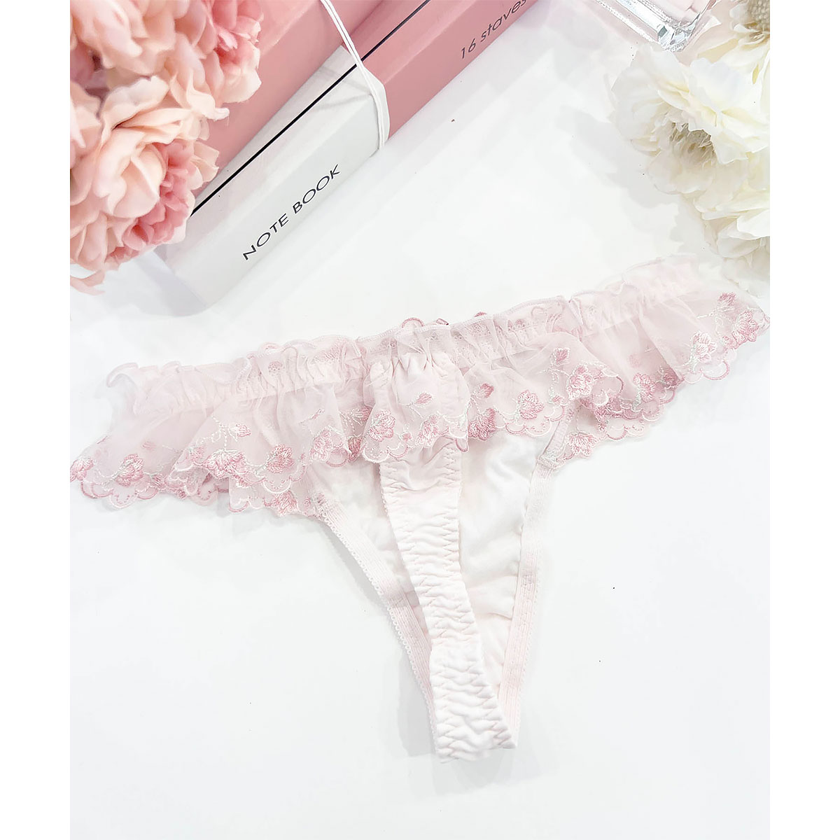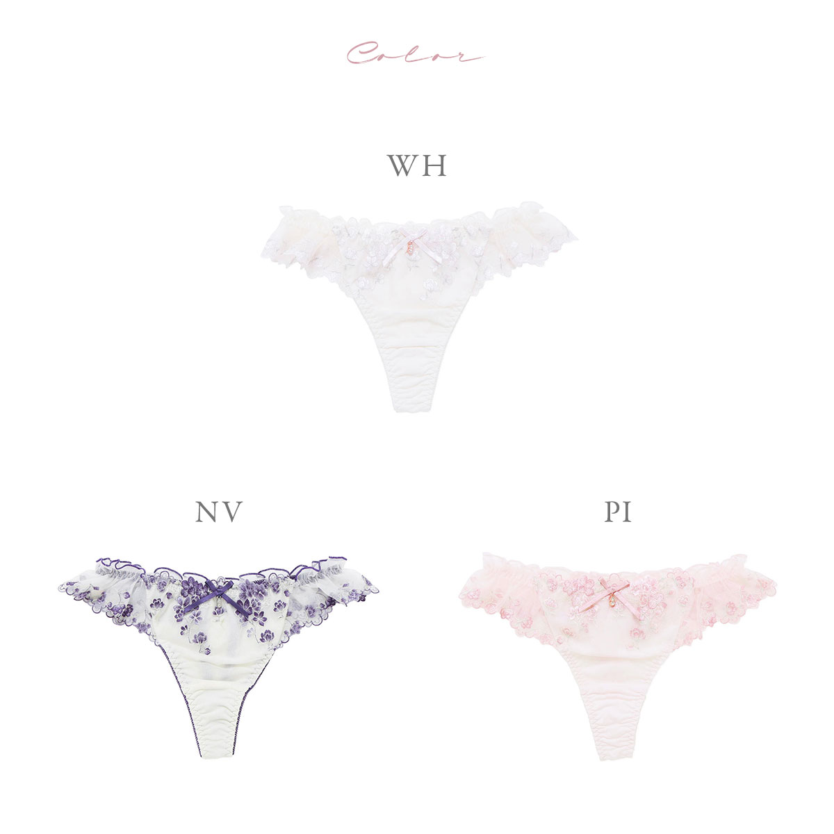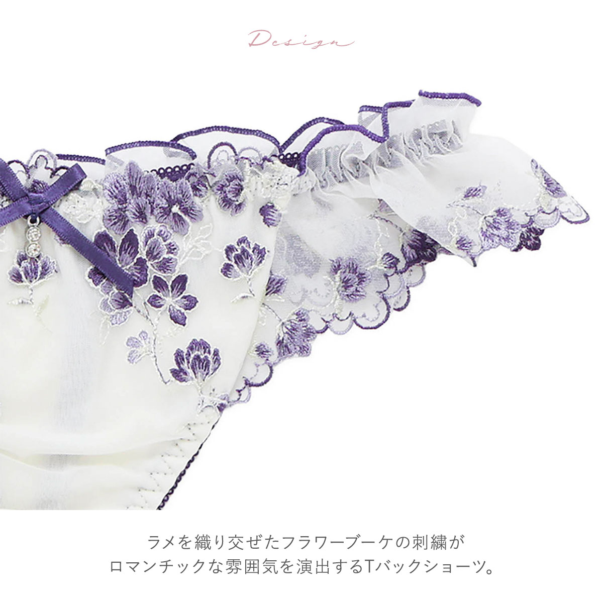 ラメを織り交ぜたフラワーブーケの刺繍がロマンチックな雰囲気を演出するTバックショーツ。サイドからバックにセット柄レースのフリルをあしらい、ふんわり可憐なシルエットに。