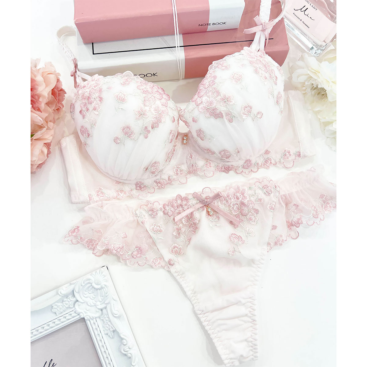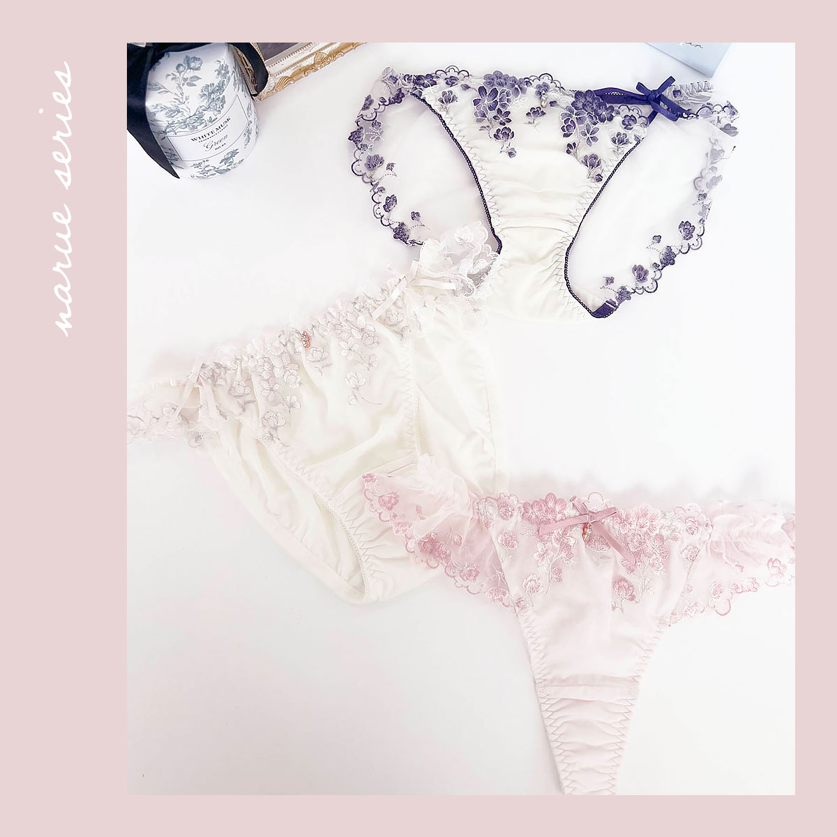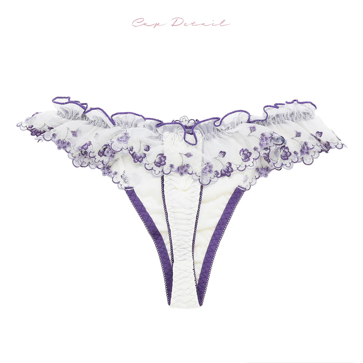 ラメを織り交ぜたフラワーブーケの刺繍がロマンチックな雰囲気を演出するTバックショーツ。サイドからバックにセット柄レースのフリルをあしらい、ふんわり可憐なシルエットに。