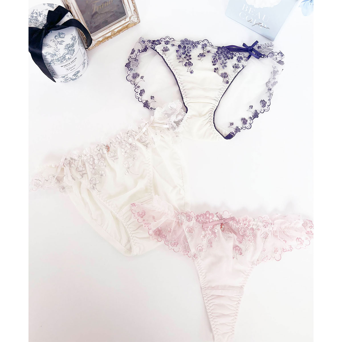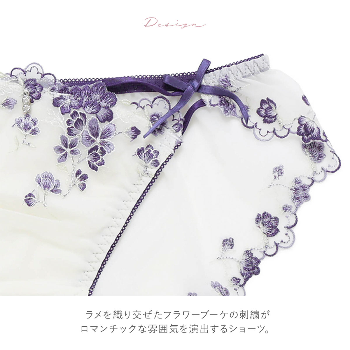 ラメを織り交ぜたフラワーブーケの刺繍がロマンチックな雰囲気を演出するショーツ。
