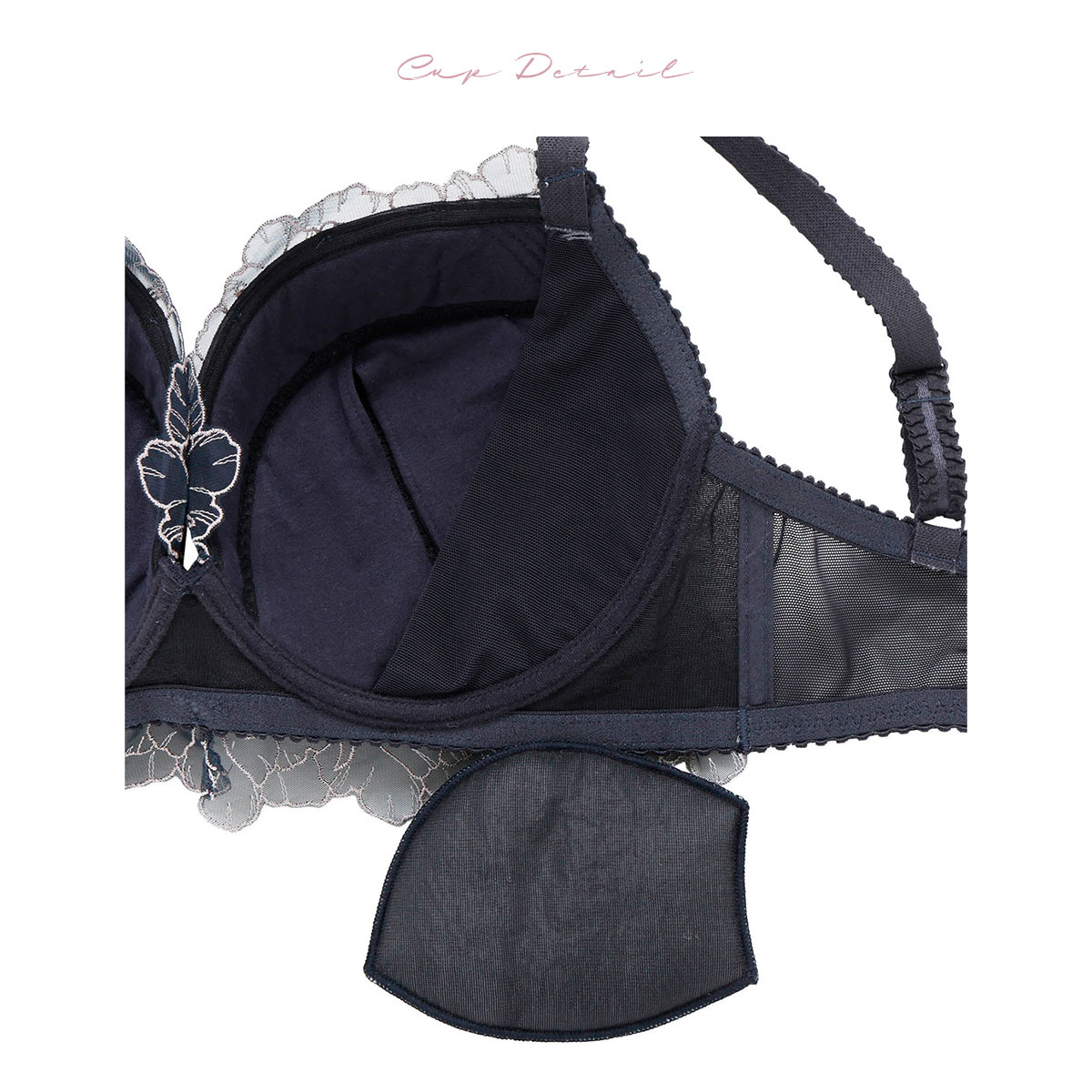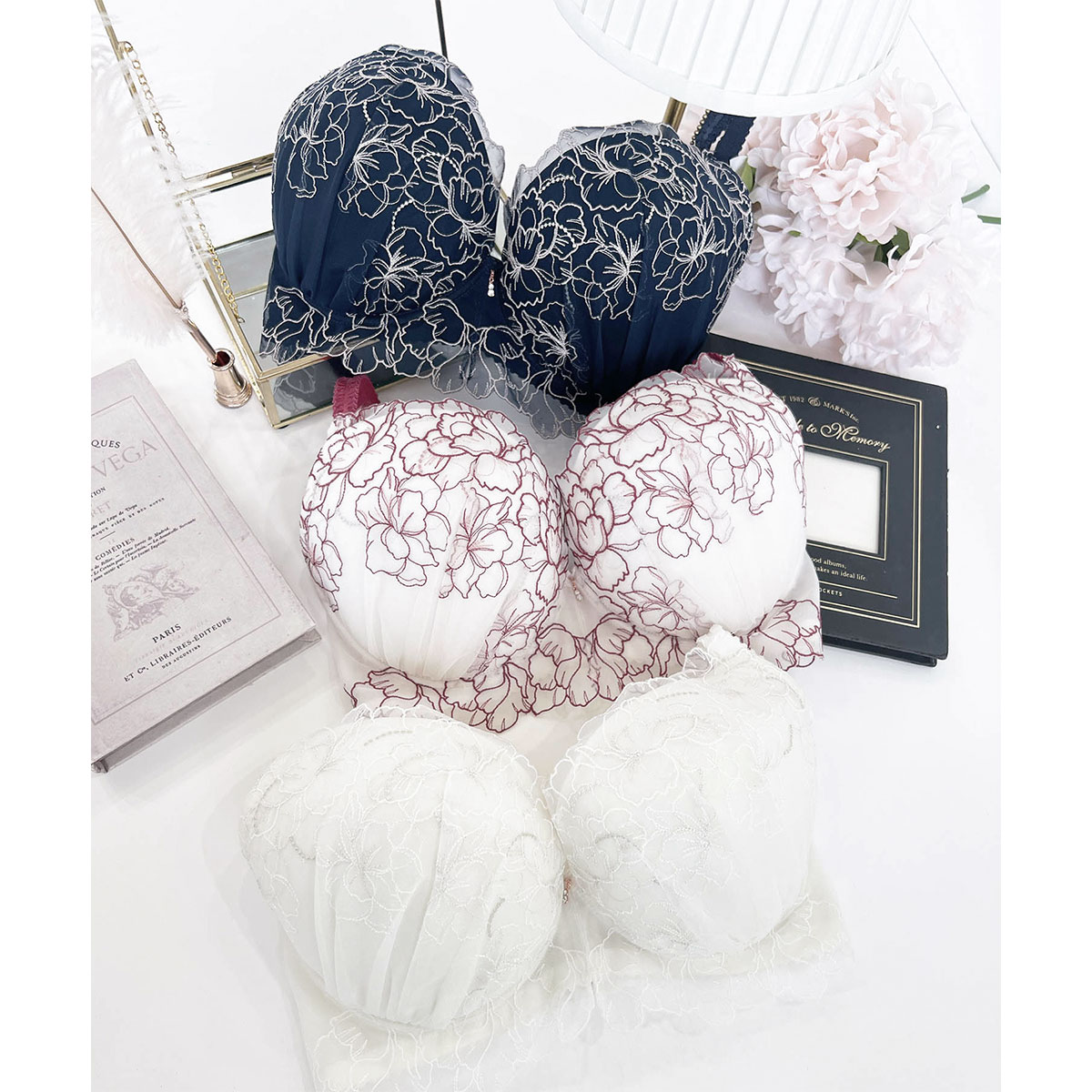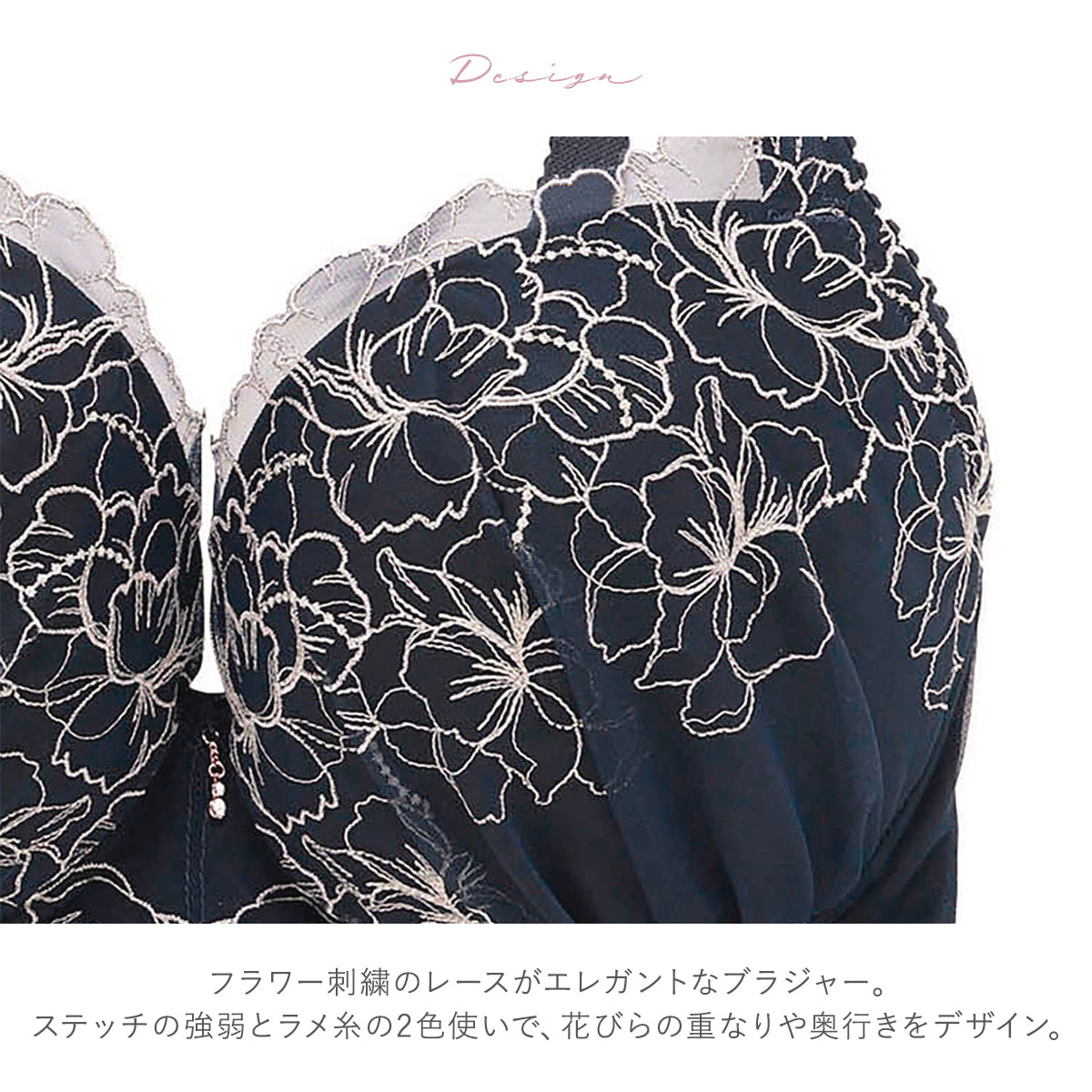 レース全体にラメ糸をあしらい、動くたびにキラキラと輝くジュエリーのような印象に仕上げた、フラワー刺繍のレースがエレガントなブラジャー。