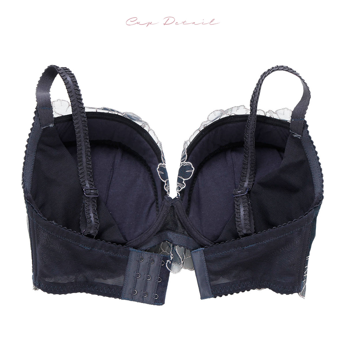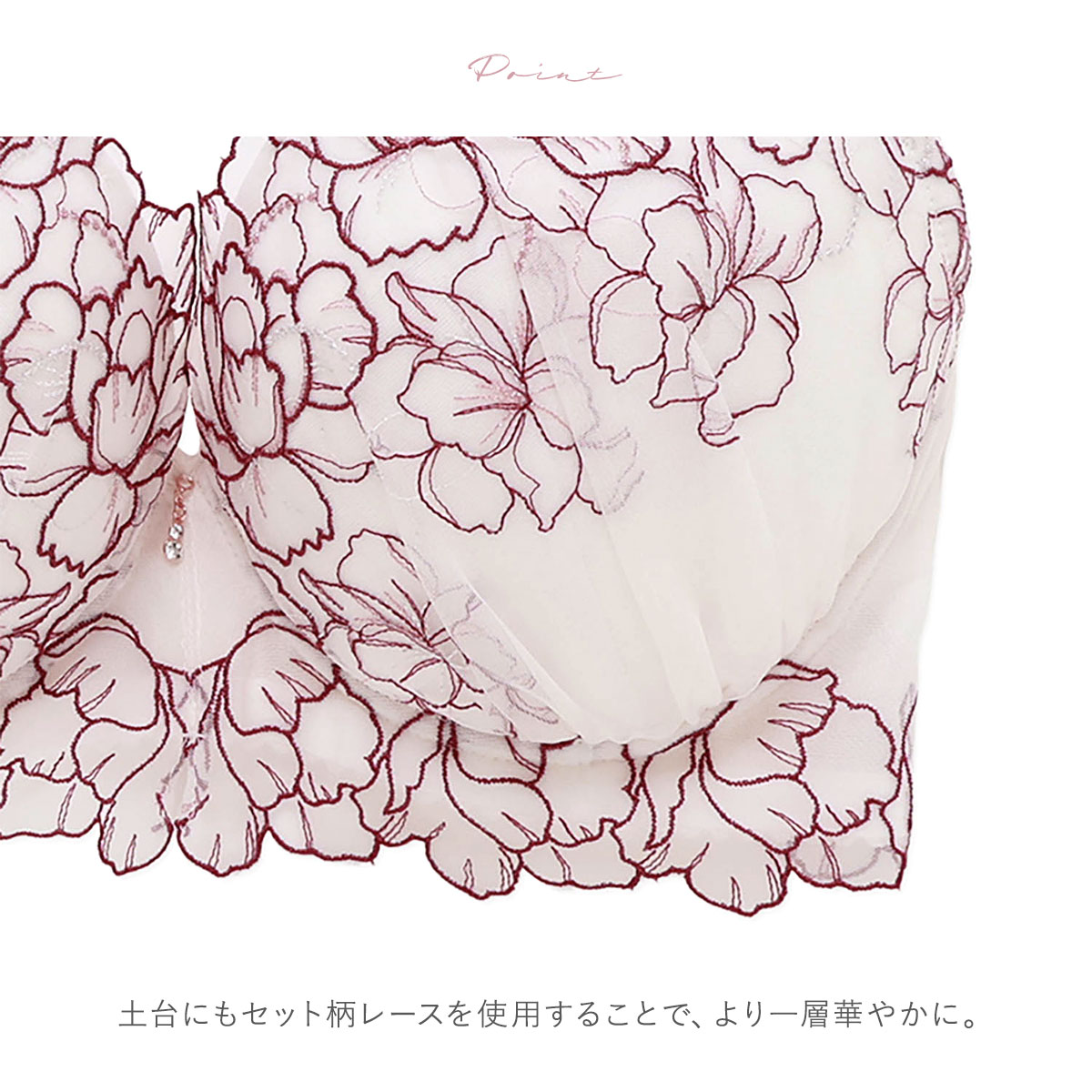 ラメが煌めく大輪のフラワー刺繍が胸元を彩るグラマーブラ