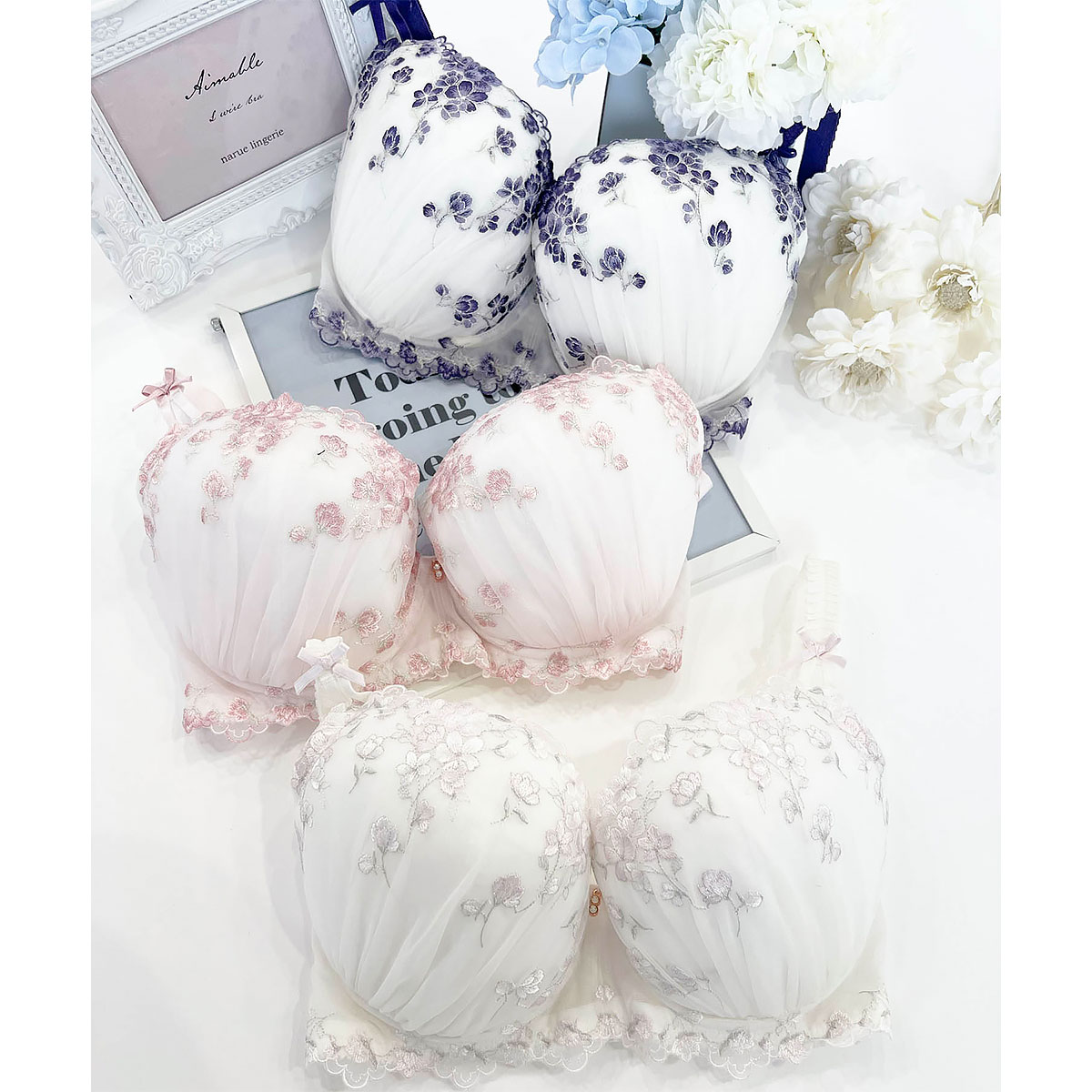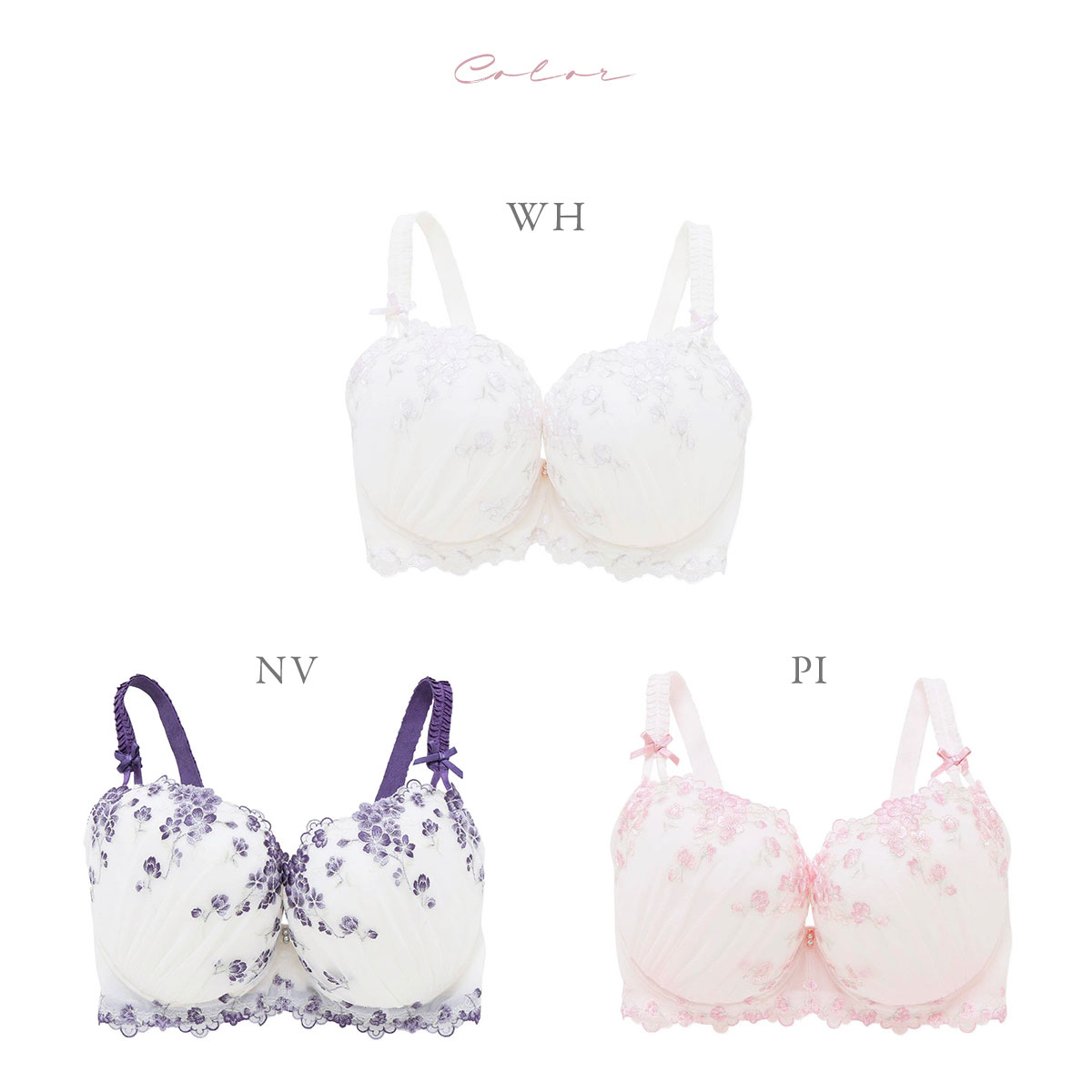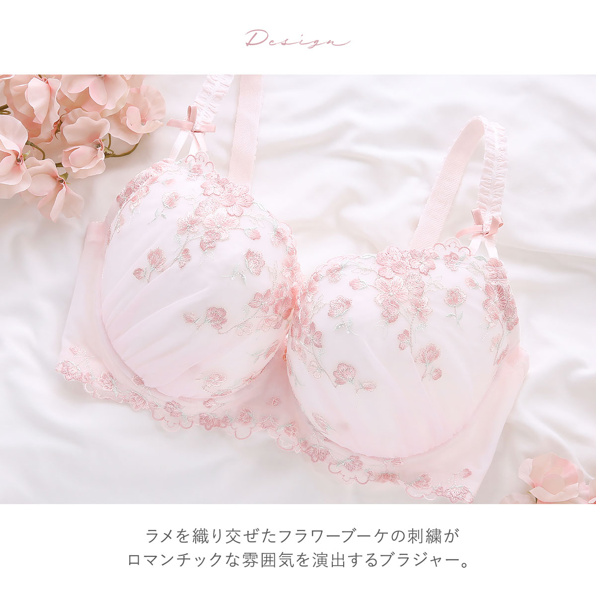 ラメを織り交ぜたフラワーブーケの刺繍がロマンチックな雰囲気を演出するブラジャー。土台にはセット柄レースを使用しより華やかに。