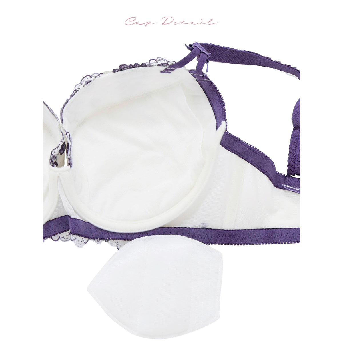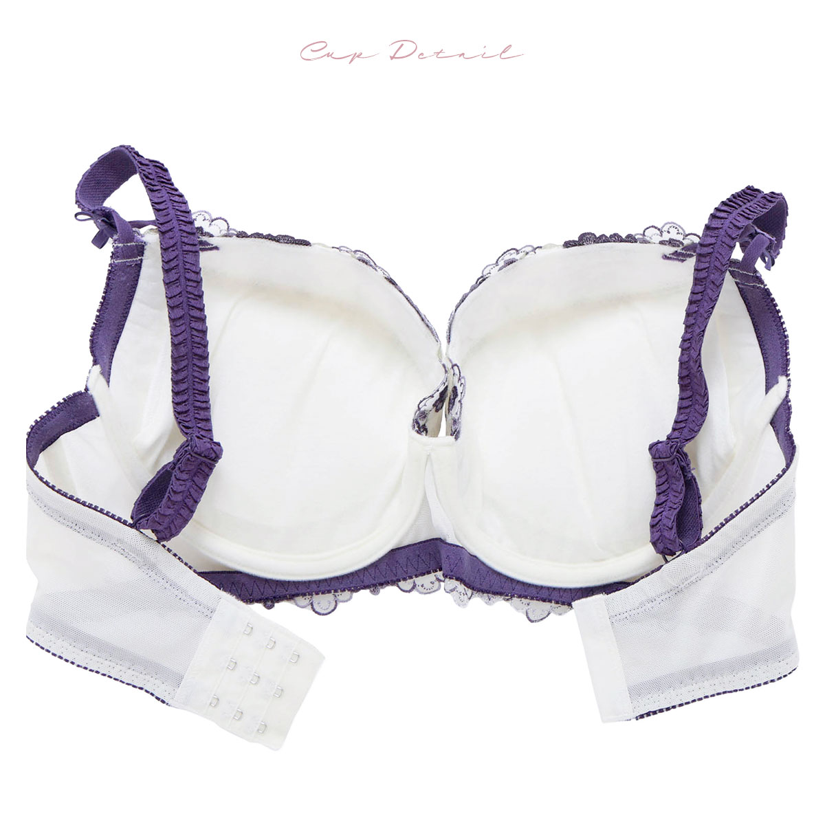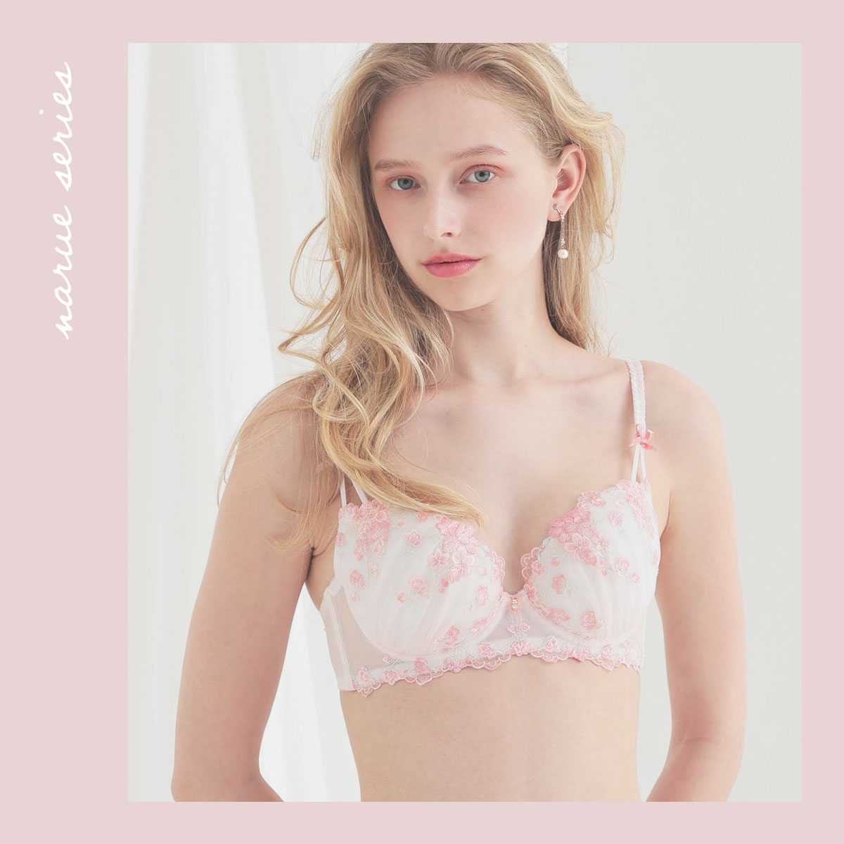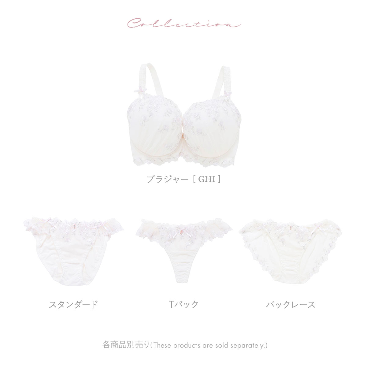 ラメを織り交ぜたフラワーブーケの刺繍がロマンチックな雰囲気を演出するブラジャー。土台にはセット柄レースを使用しより華やかに。