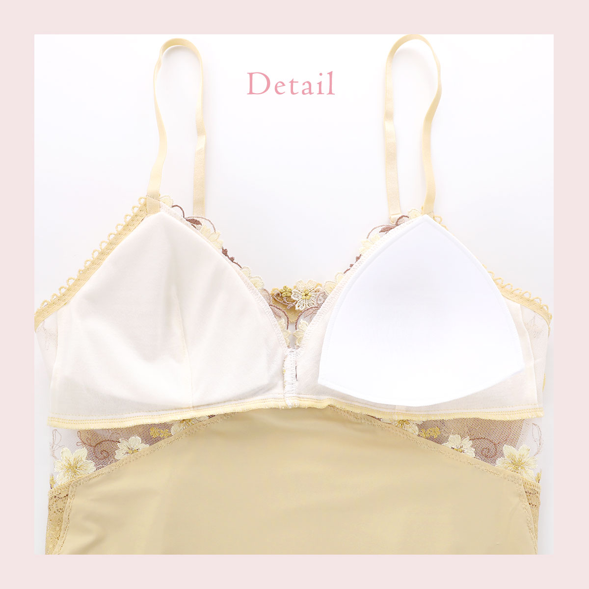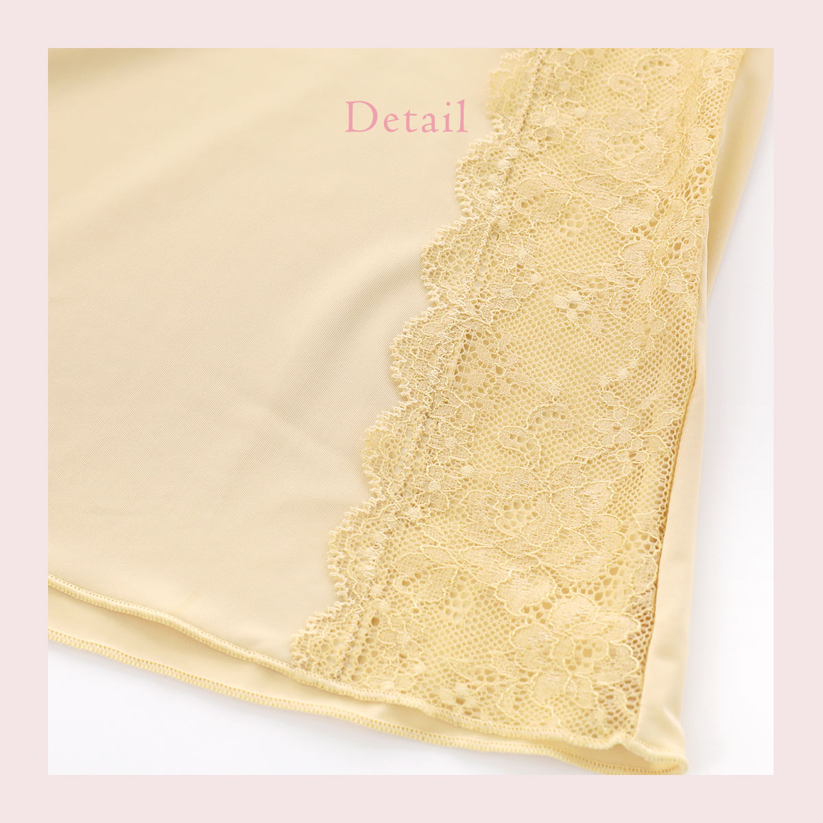 サイドのレース切り替えで縦ラインを強調してスタイルアップを叶えるカップ付きキャミソール。パッドは取り外し可能。ストラップはアジャスターつきで長さの調節ができます。身生地はすべりがよい素材を使用しており、さらりとした気持ちの良い着心地。伸縮性があり、ご着用していてストレスを感じにくい仕様になっております。