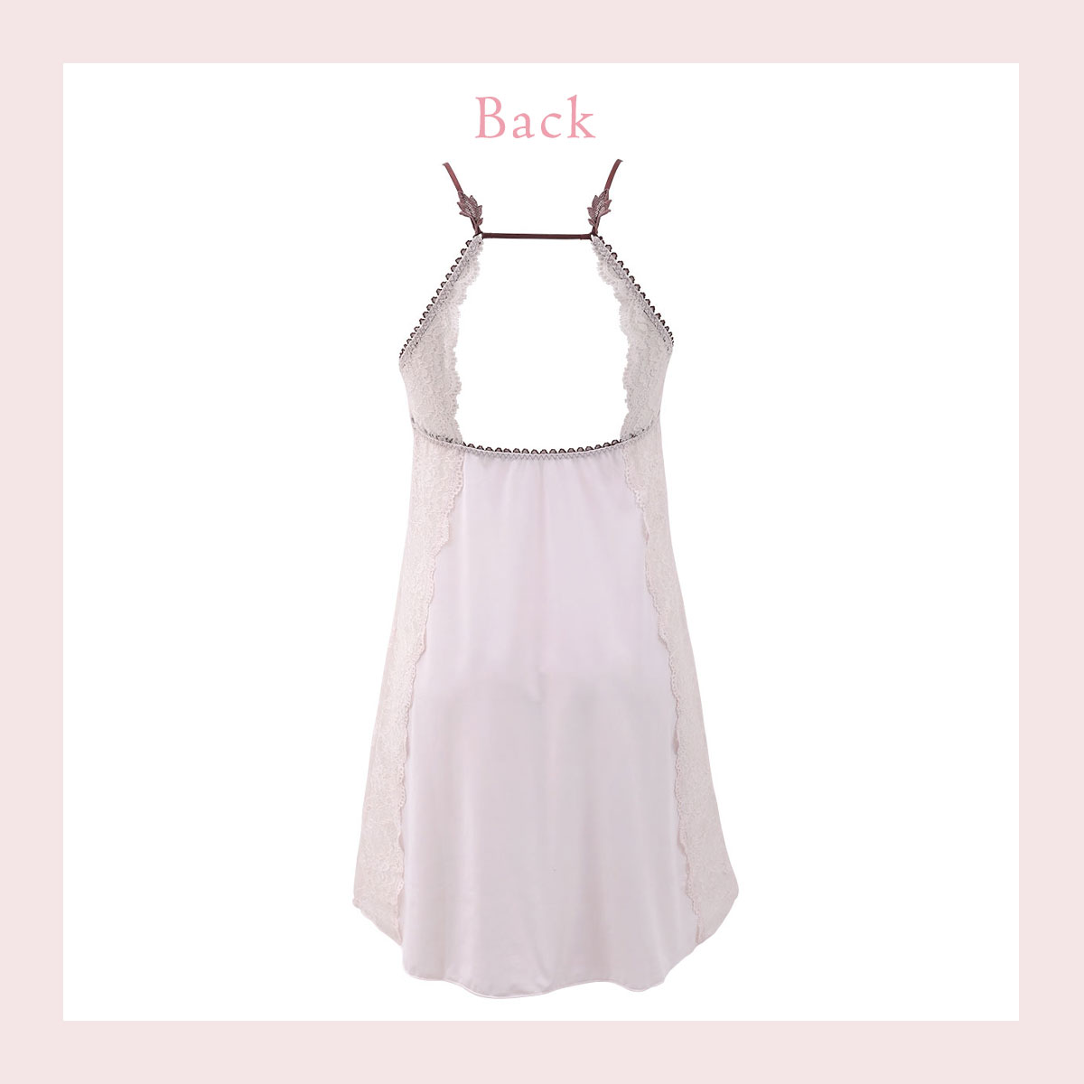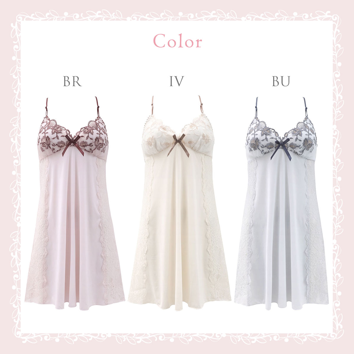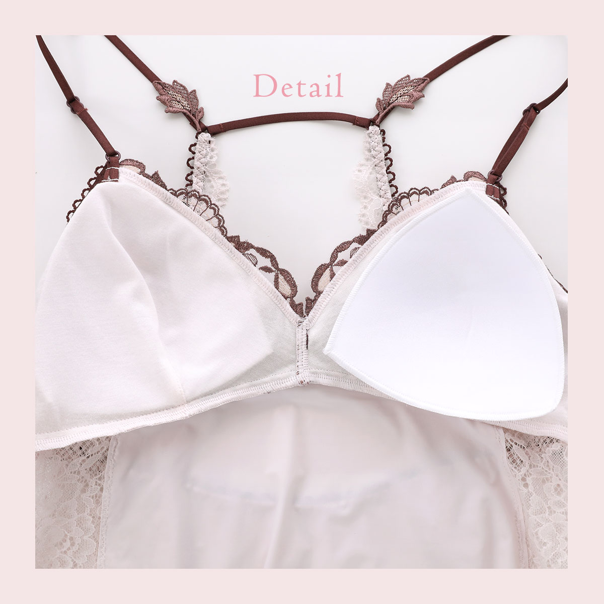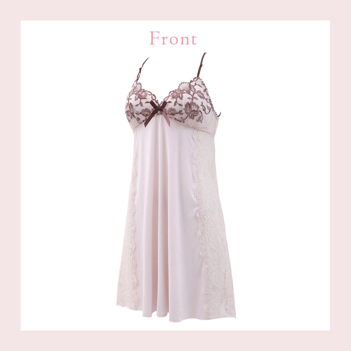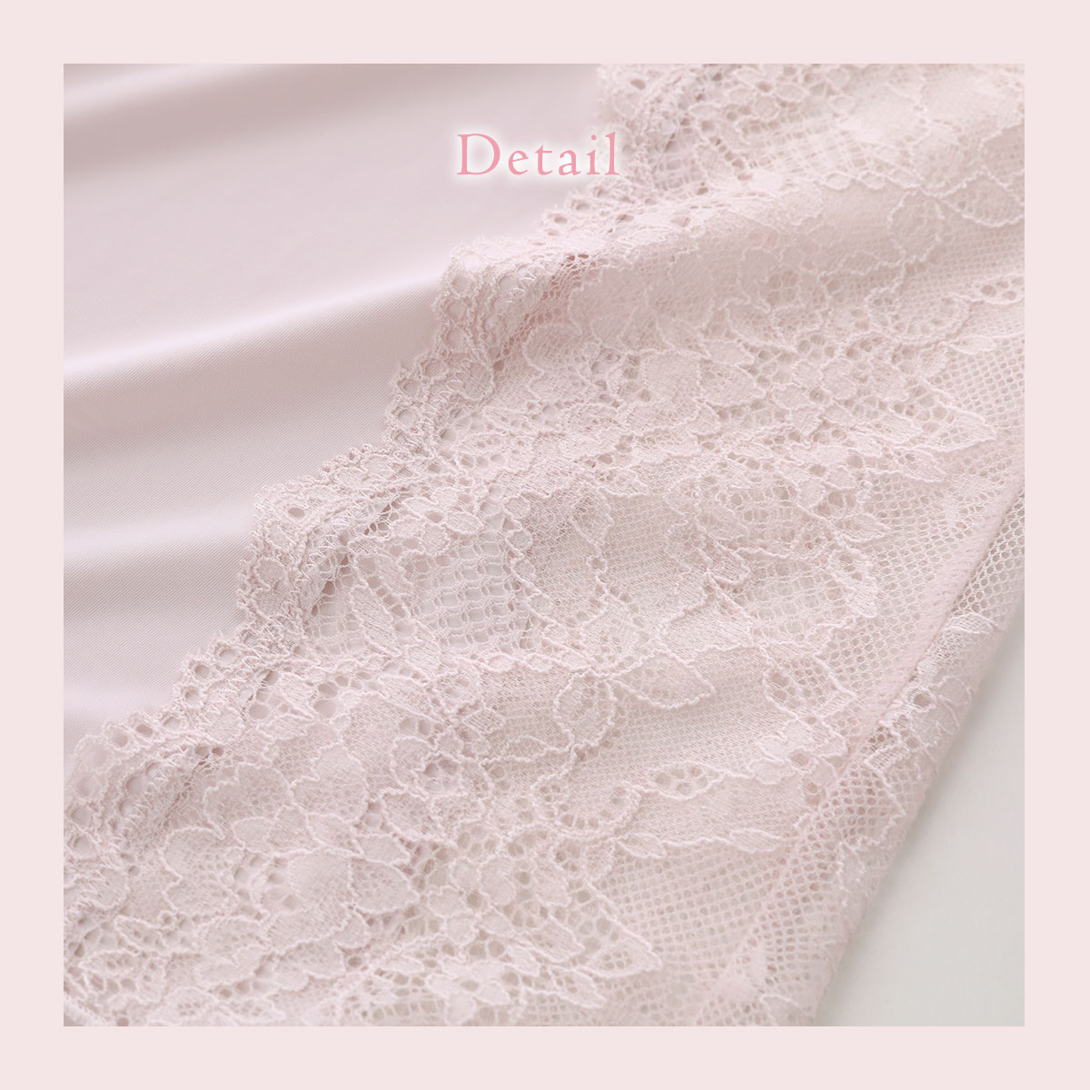 1枚でご着用いただけるカップ付きキャミソール。両サイドにあしらったストレッチレースで、縦ラインを強調してスタイルアップ。大胆に開いたバックスタイルはポイントでアップリケをあしらい、細めのストラップが上品でおしゃれな印象に仕上がりました。身生地はすべりがよい素材を使用しており、さらりとした気持ちの良い着心地です。