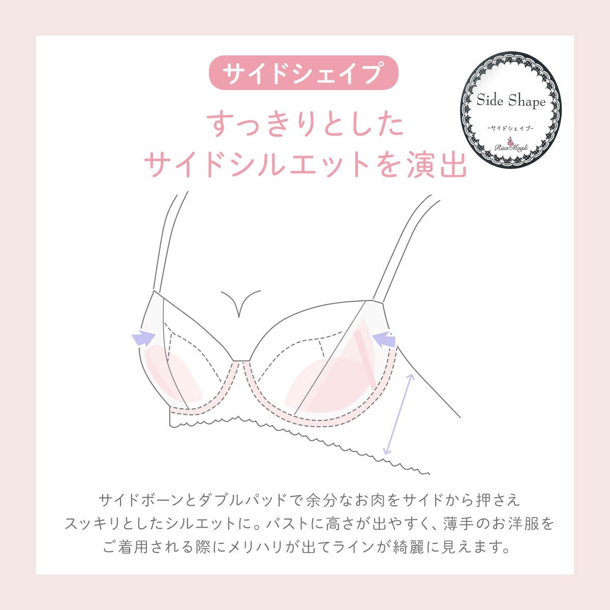 カップパターンは、サイドボーンで脇のお肉をトップ中心に寄せてバストを美しく魅せてくれるSide Shape(サイドシェイプ)パターン。取り外し可能なWパッド付きでボリュームアップが叶う優れもの。バストに高さが出やすく、薄手のお洋服を着用される際にメリハリが出てラインが綺麗に見えます。