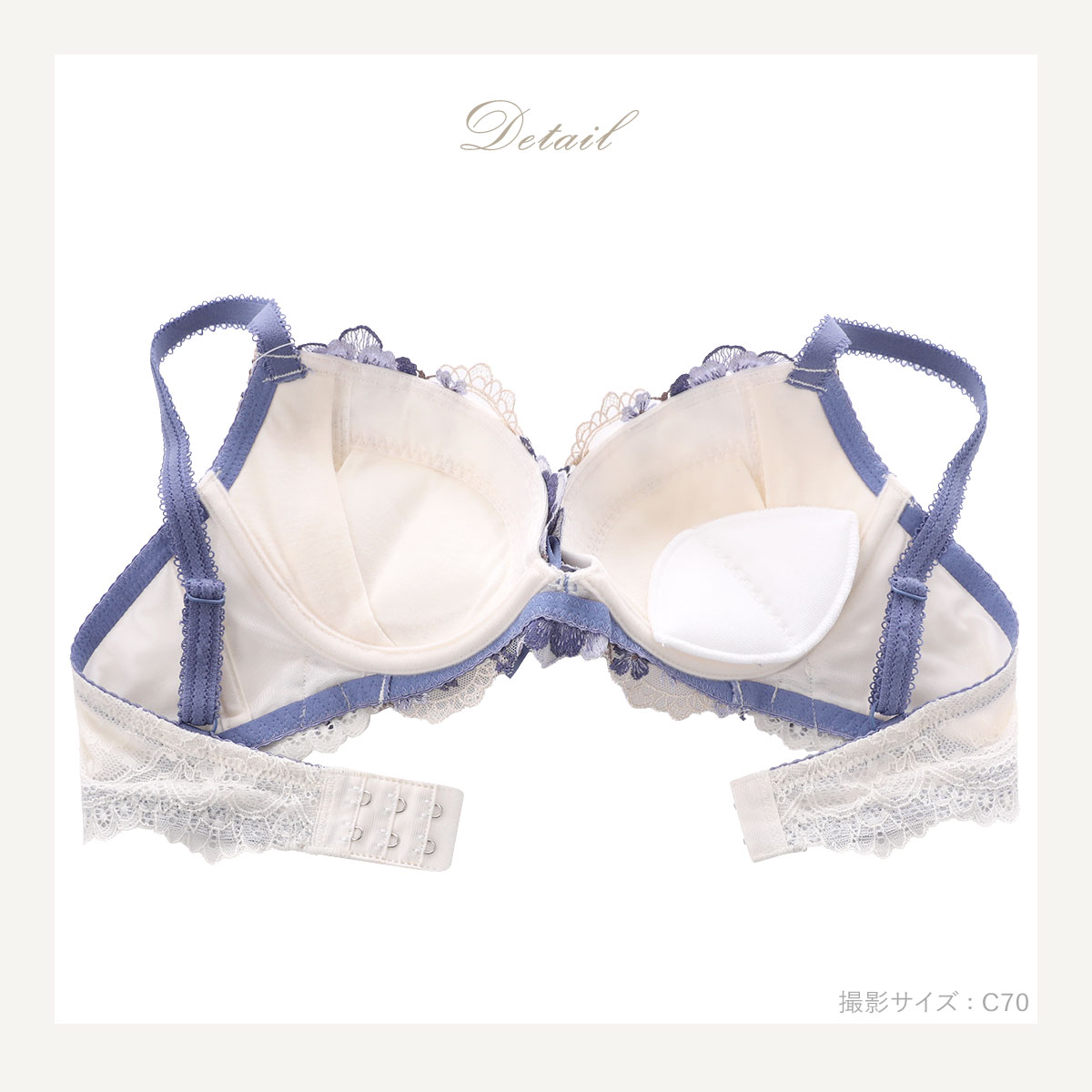 前中心が低いワイヤーとカップのサイドパネルで、バストを中央に寄せて美しいV字を演出する、V Make Typeパターンです。取り外し可能パッドでボリューム調整もできます。カップ裏のサイドには、脇に流れるバストを引き寄せるパネル付きで、脇もすっきり。
