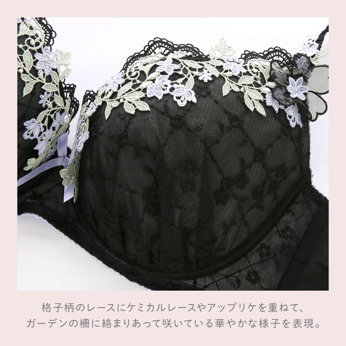 お花たちが咲きほこるガーデンをイメージしたレトロ感のあるデザインの、リサマリ「ジニー」コレクション。全体に小花を散りばめた格子柄のレースは、レースと同じカラーのあたたかみのあるウーリー糸で刺繍することで、ナチュラルな可愛らしさに。その上からクレマチスのお花をイメージしたケミカルレースと、ストラップにはアップリケを重ねて、お花たちがガーデンの柵に絡まり合って咲いている華やかな様子を表現しています。