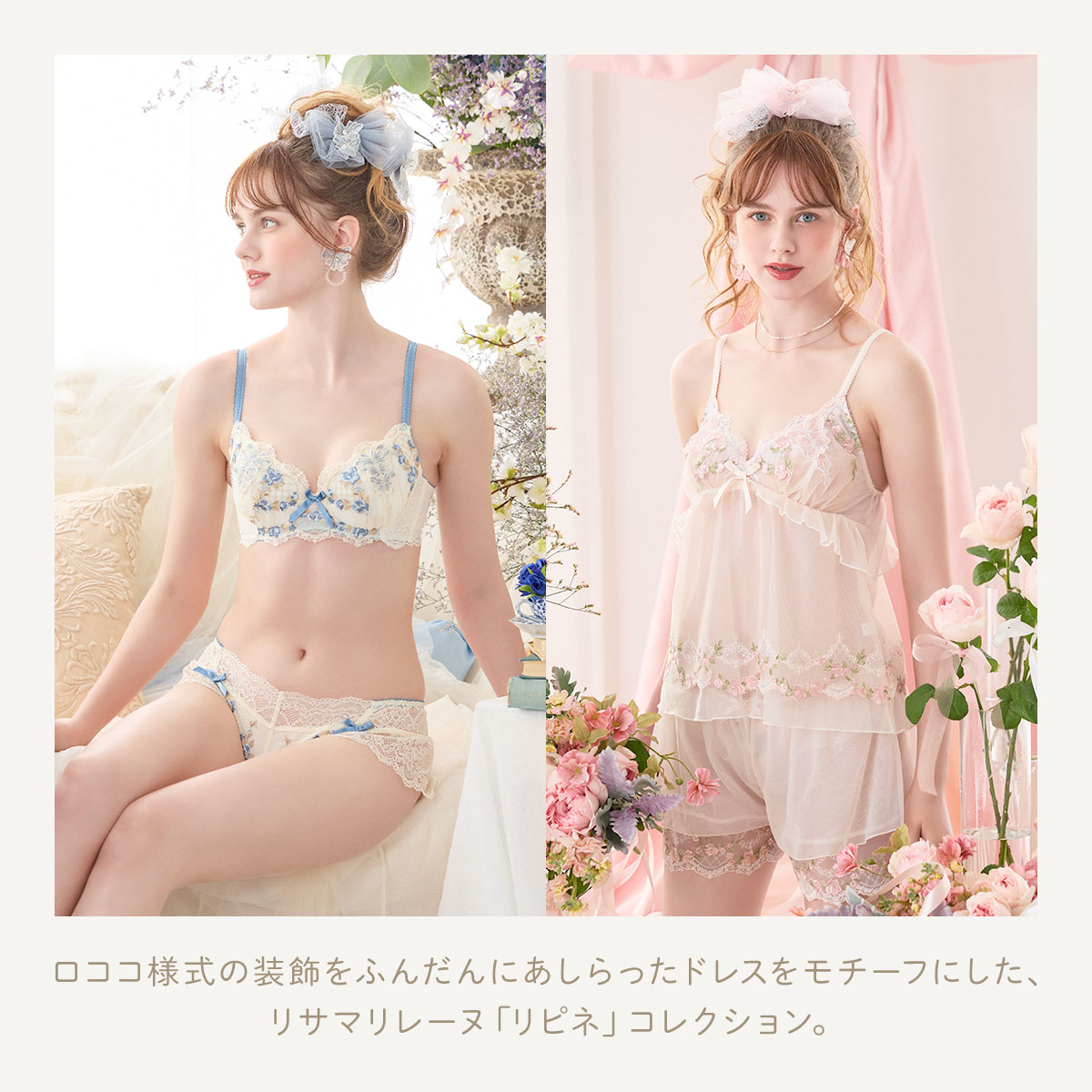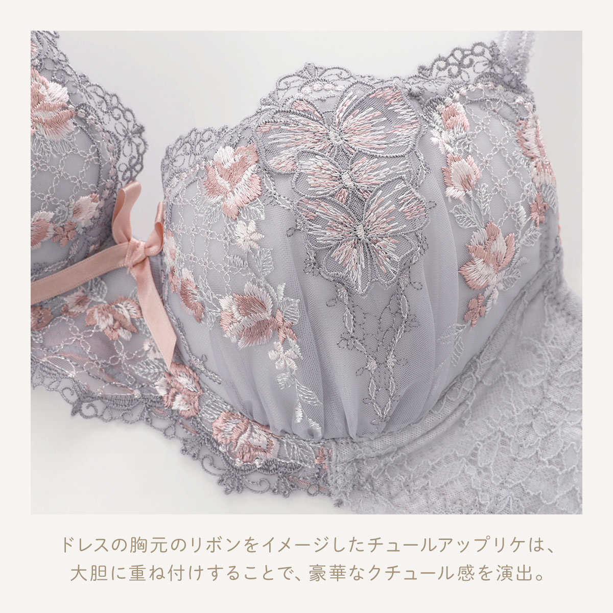 フランスのロココ様式の装飾をふんだんにあしらったドレスをモチーフにした、リサマリレーヌ「リピネ」コレクション。ドレスの胸元のリボンをイメージしたチュールアップリケは、大胆に重ね付けすることで、豪華なクチュール感を演出。繊細なグラデーションと丸みのあるシルエットで、手でふわっと結んだようなやわらかい印象に。お花は密度のあるステッチで立体的に仕上がりました。