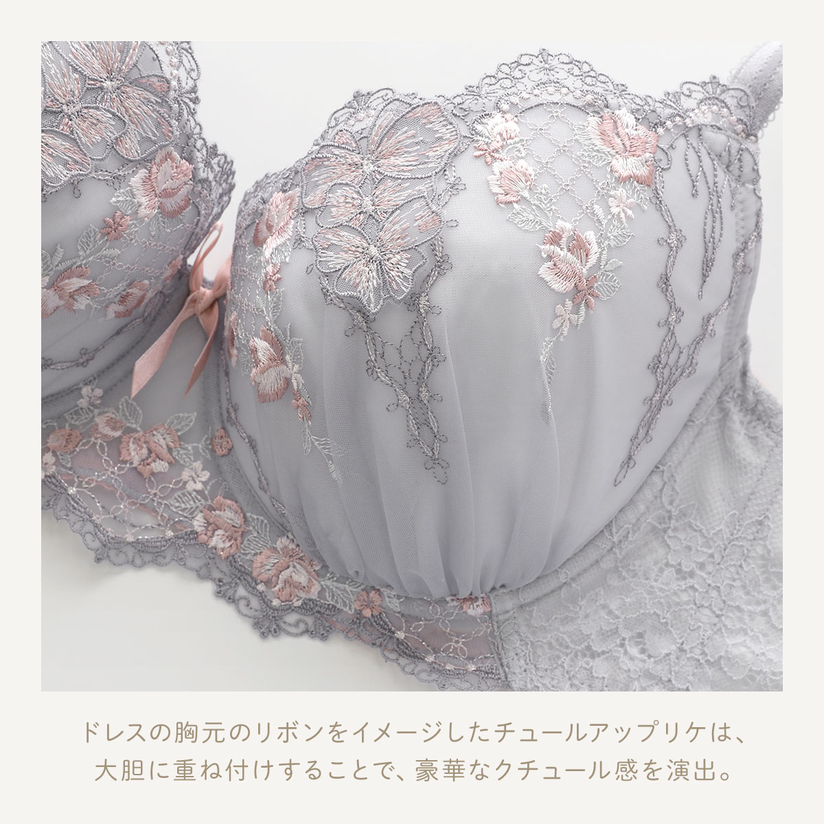 フランスのロココ様式の装飾をふんだんにあしらったドレスをモチーフにした、リサマリレーヌ「リピネ」コレクション。ドレスの胸元のリボンをイメージしたチュールアップリケは、大胆に重ね付けすることで、豪華なクチュール感を演出。繊細なグラデーションと丸みのあるシルエットで、手でふわっと結んだようなやわらかい印象に。お花は密度のあるステッチで立体的に仕上がりました。