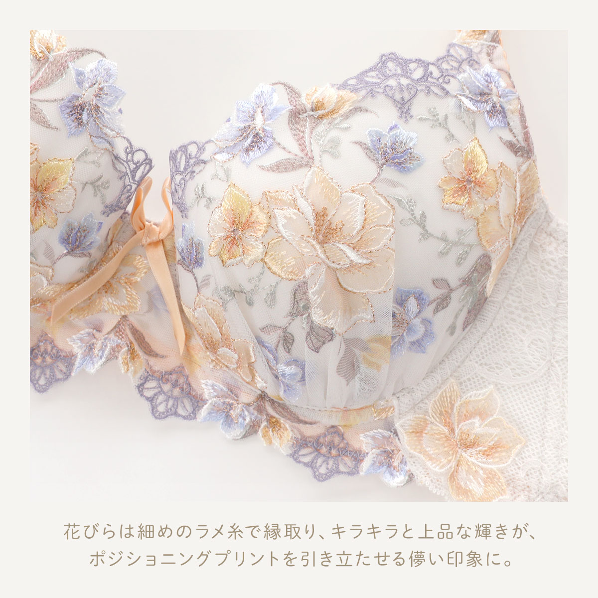 西洋絵画をイメージした、ポジショニングプリントを贅沢にほどこしたシリーズ、リサマリレーヌ「ジェシー」コレクション。花びらは細めのラメ糸で縁取り、キラキラと上品な輝きが、ポジショニングプリントを引き立たせる儚い印象に仕上がりました。スモーキーで落ち着きのあるカラーリングで、自分だけのアートを身に着けるような特別感を演出します。