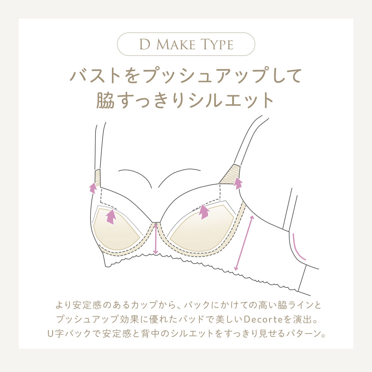クッション性のあるパッドと脇高のサイドでふっくら谷間をメイクする、D Make Type。取り外し可能なパッドは、適度なハリ感がありながらもバストに柔らかくフィットします。カップサイドはボーンを斜めに付け、脇肉をバストへしっかりと寄せます。U字バックで安定感のある着け心地です。