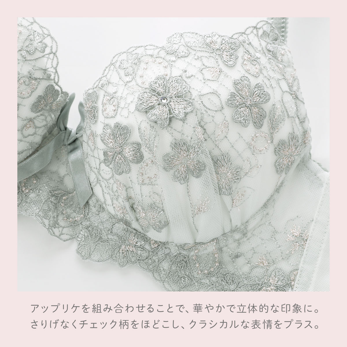 アンティークレースをあしらったウェディングドレスをイメージした、クラシカルで気品あふれるリサマリ「ドーラ」コレクション。レースにあしらわれた小花は、パッカー手法とアップリケを組み合わせることで、華やかで立体的な印象に。その周りにはさりげなくチェック柄をほどこし、クラシカルな表情をプラスしています。さらに、アップリケのラインストーンと全体にあしらわれた繊細なラメ糸が、キラキラと上品な輝きを演出しています。
