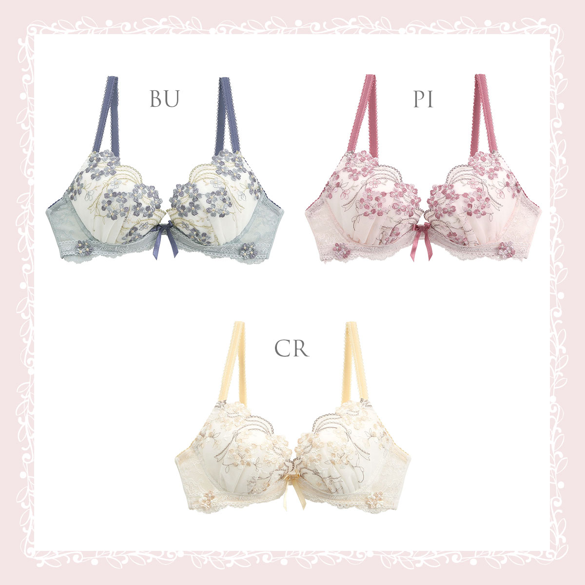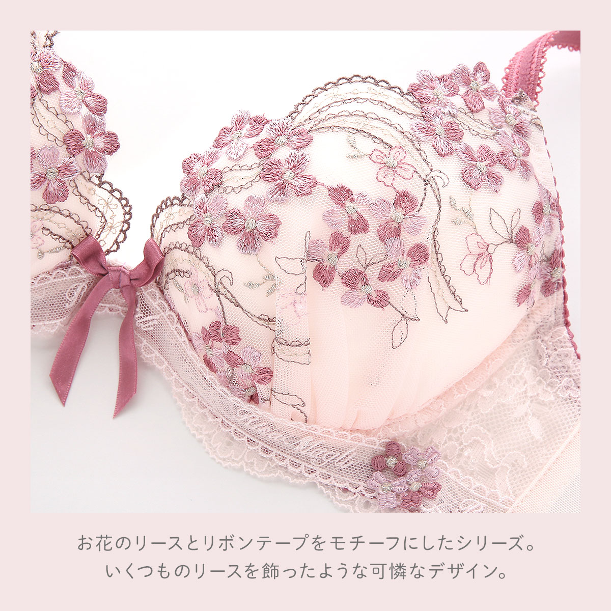 お花のリースとリボンテープをモチーフにした「クラーラ」コレクション。円を描いたバージニアストックのお花と、ふんわり揺れるリボンテープの刺しゅうを組み合わせて、まるでいくつものリースを飾ったような可憐なデザインに仕上がりました。カップ下にはリサマリロゴが入ったオリジナルの刺しゅうテープを重ねて、思わず心ときめくディテールに。サイドには小さなリースのアップリケを添えています。
