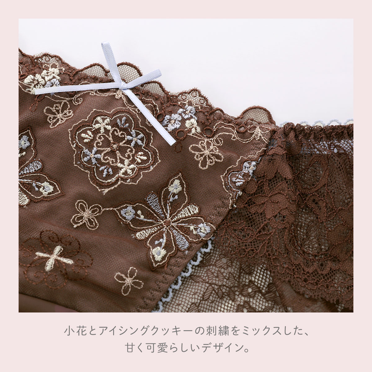 小花とアイシングクッキーの刺繍をミックスした、甘く可愛らしいデザインの「キャシー」コレクション。丸みのあるスカラップはボーラー手法をほどこし、手作りクッキーのようなイメージに仕上がりました。クッキー型のアップリケには輝くラインストーンを添えて、華やかさをプラス。