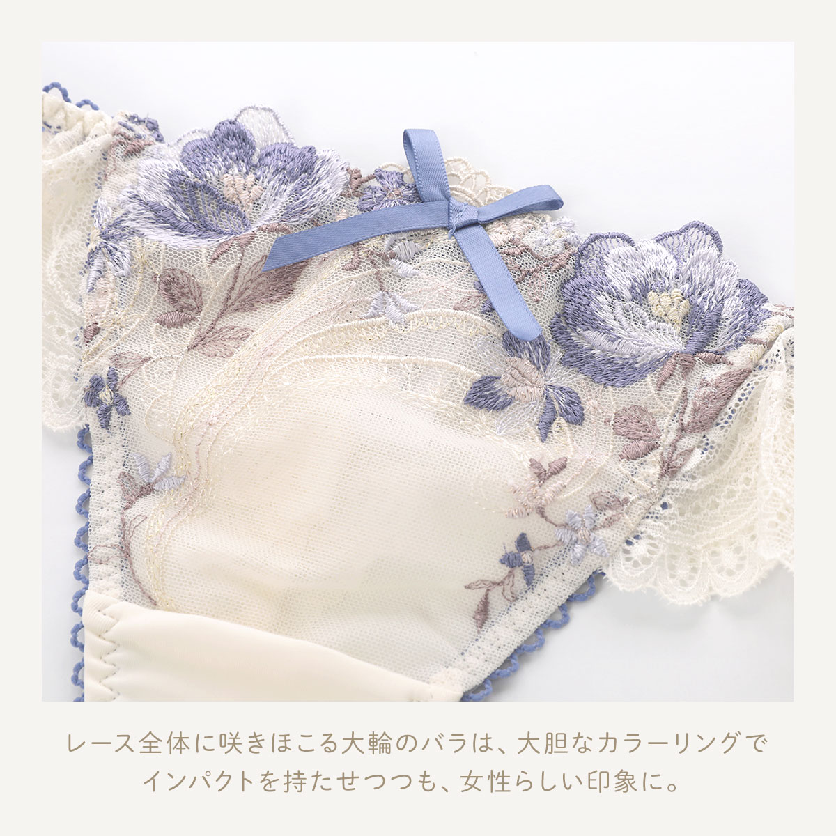 バラのお花と扇形模様を組み合わせた、リサマリレーヌ「サリー」コレクション。レース全体に咲きほこる大輪のバラは、大胆なカラーリングでインパクトを持たせつつも、女性らしい印象に。周りには様々な小花の刺繍をあしらい、可愛らしさをプラスしました。