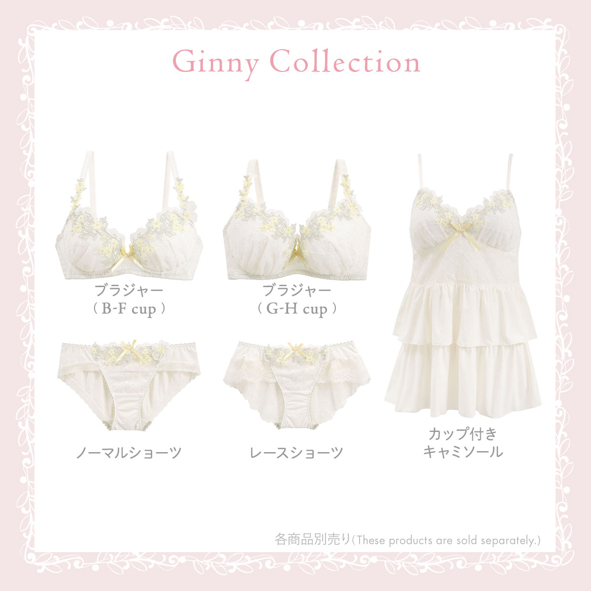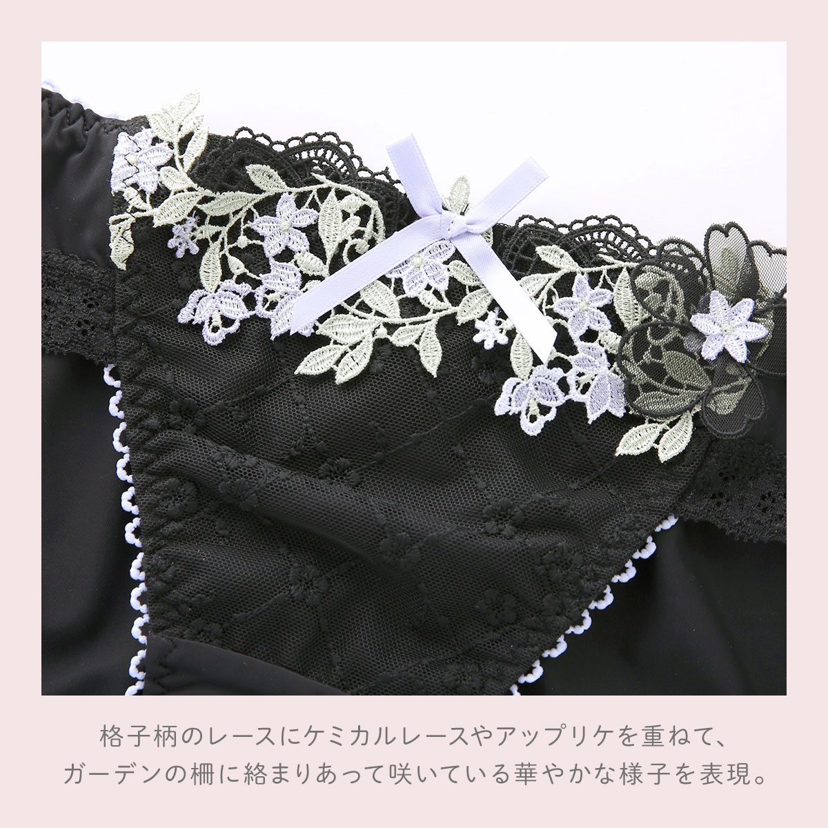お花たちが咲きほこるガーデンをイメージしたレトロ感のあるデザインの、リサマリ「ジニー」コレクション。全体に小花を散りばめた格子柄のレースは、レースと同じカラーのあたたかみのあるウーリー糸で刺繍することで、ナチュラルな可愛らしさに。その上からクレマチスのお花をイメージしたケミカルレースと、ストラップにはアップリケを重ねて、お花たちがガーデンの柵に絡まり合って咲いている華やかな様子を表現しています。