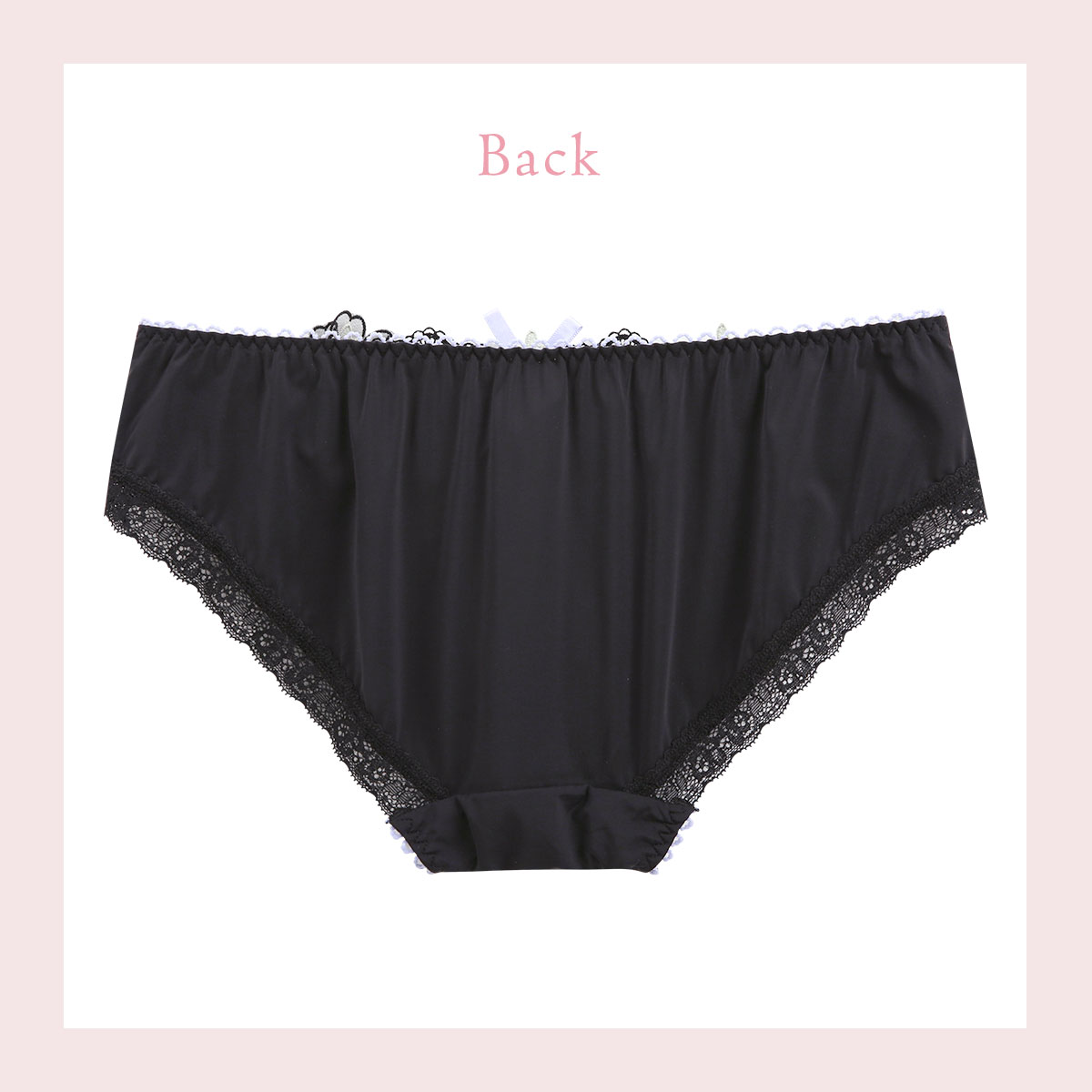 バックの身生地は、肌あたりなめらかな素材です。縦横にストレッチ性があり、ヒップにフィットします。バック足口はレース付きで後ろ姿も華やかに。