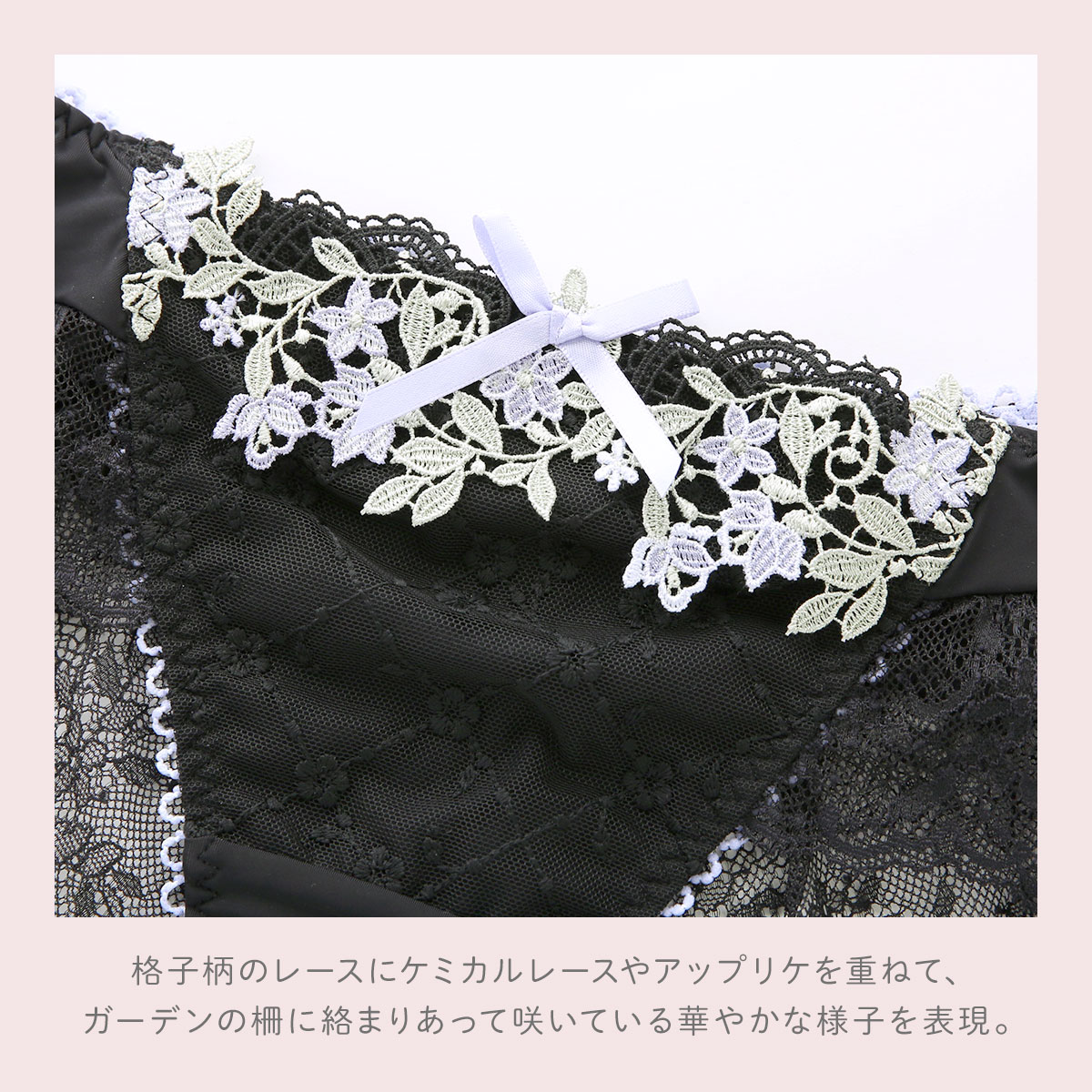 お花たちが咲きほこるガーデンをイメージしたレトロ感のあるデザインの、リサマリ「ジニー」コレクション。全体に小花を散りばめた格子柄のレースは、レースと同じカラーのあたたかみのあるウーリー糸で刺繍することで、ナチュラルな可愛らしさに。その上からクレマチスのお花をイメージしたケミカルレースと、ストラップにはアップリケを重ねて、お花たちがガーデンの柵に絡まり合って咲いている華やかな様子を表現しています。