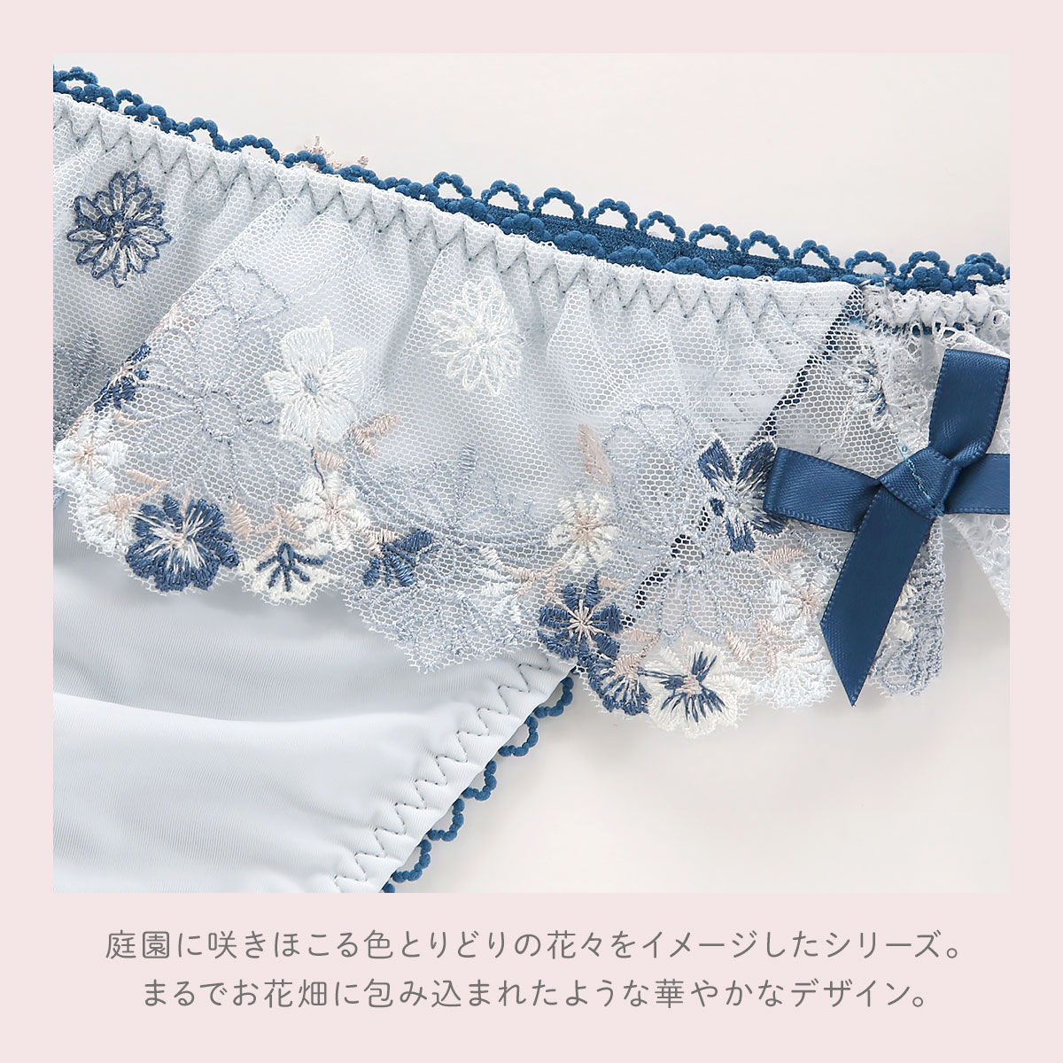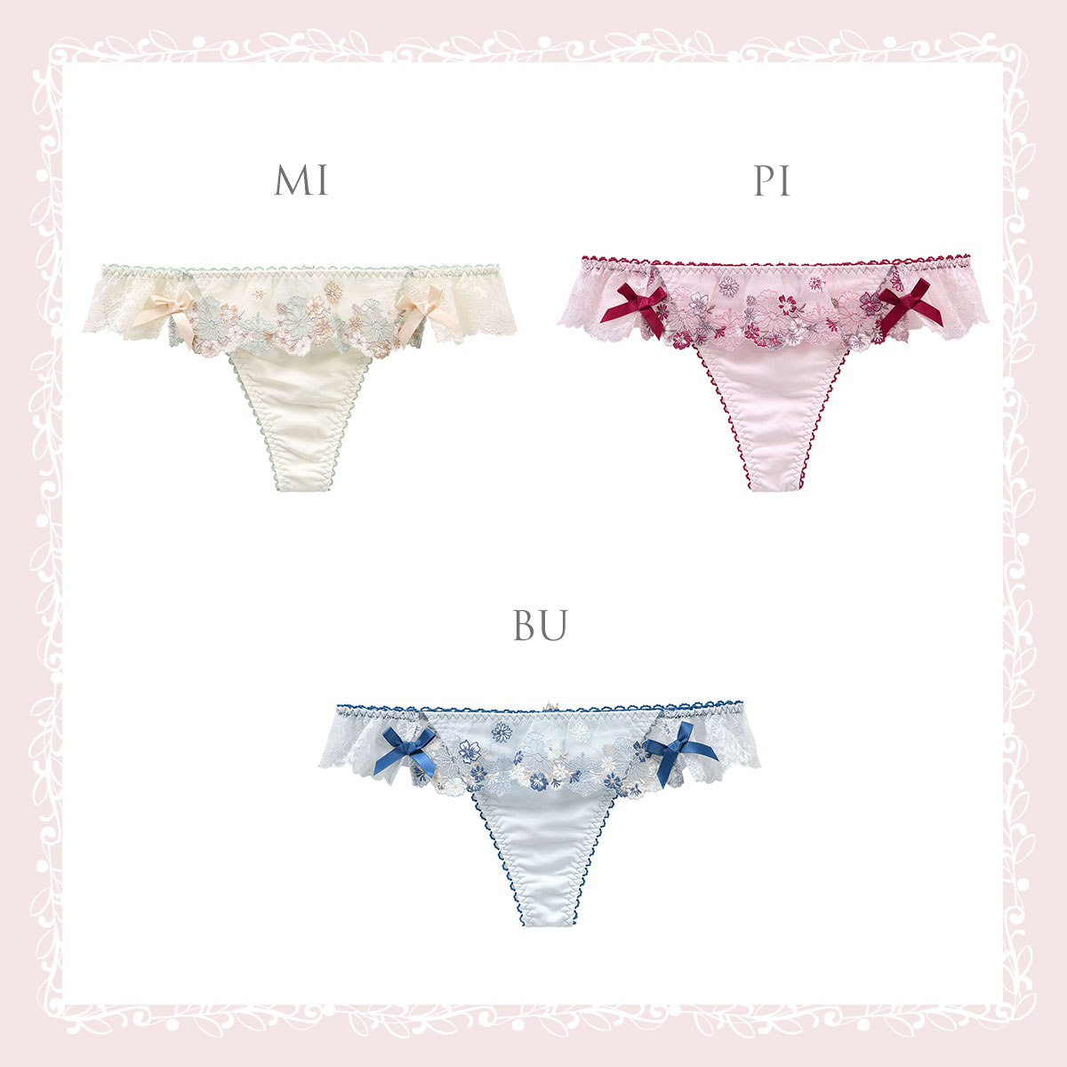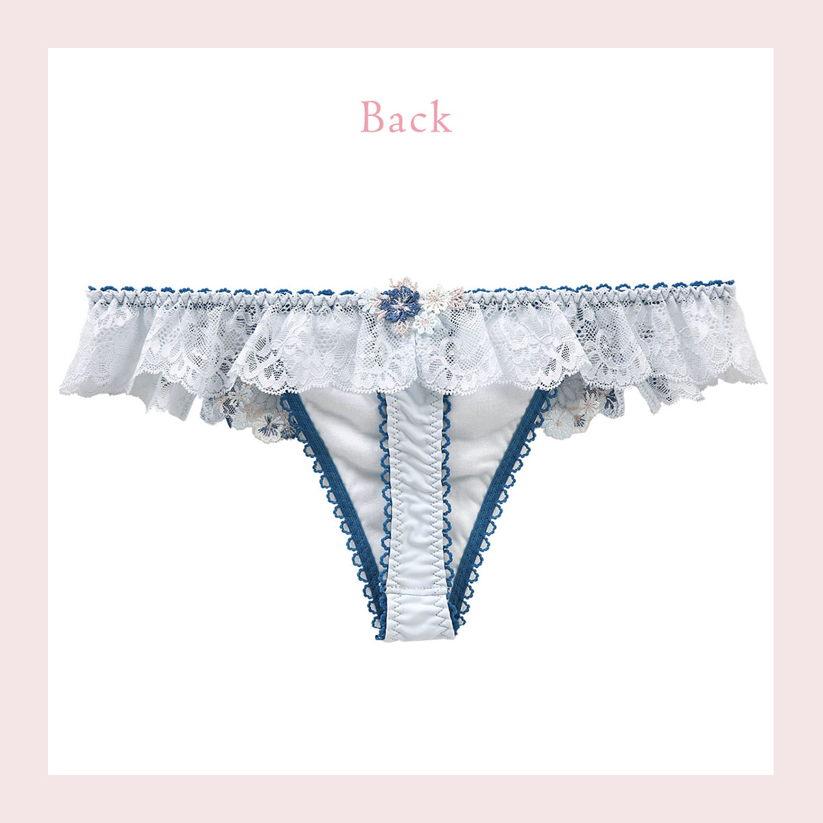 ウエストにレースのフリルデザインをあしらったTバックショーツ。フロントサイドにはスリットとサテンリボンを添えて、フェミニンな印象に。