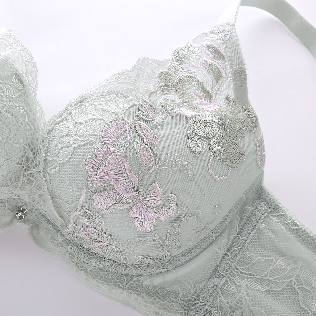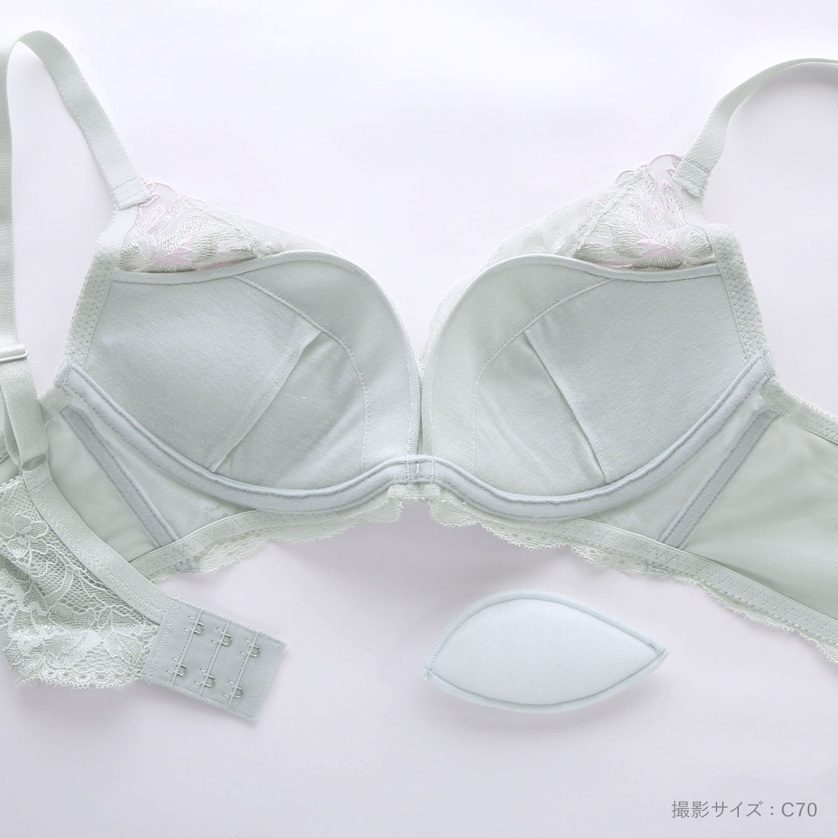 モールドカップはバストの上辺が沿うようにこだわり、取り外しできるパッド付きで、お好みでボリューム調整ができます。前中心低めで、カシュクール型になっているのでワイヤーの当たりが痛くならない仕様になっています。