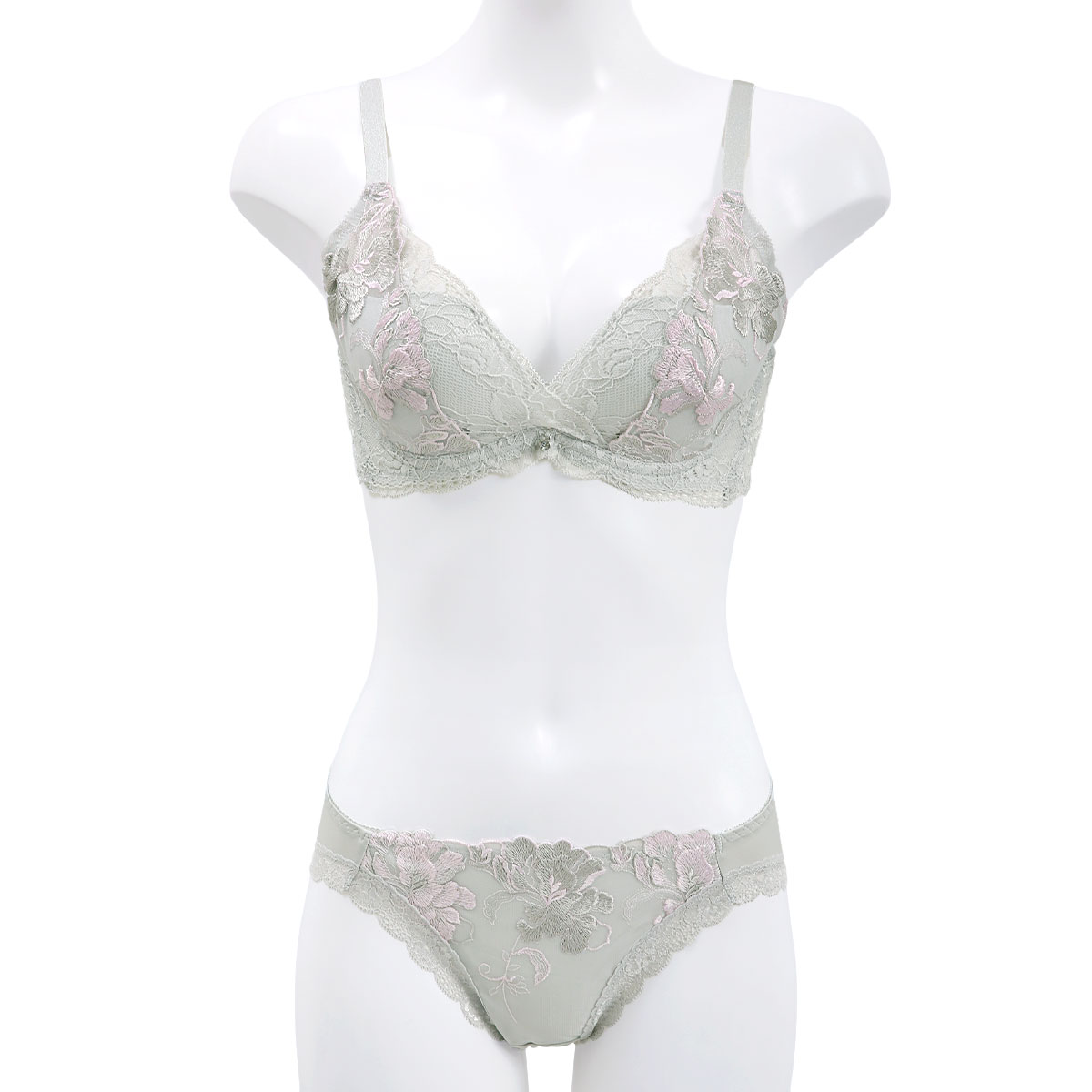 脇高仕様で気になる脇肉をしっかりおさめてくれるビーオーエヌの大人気パターンのシリーズ。華やかな大花柄レースが美しい、カシュクールタイプのブラショーツセット。