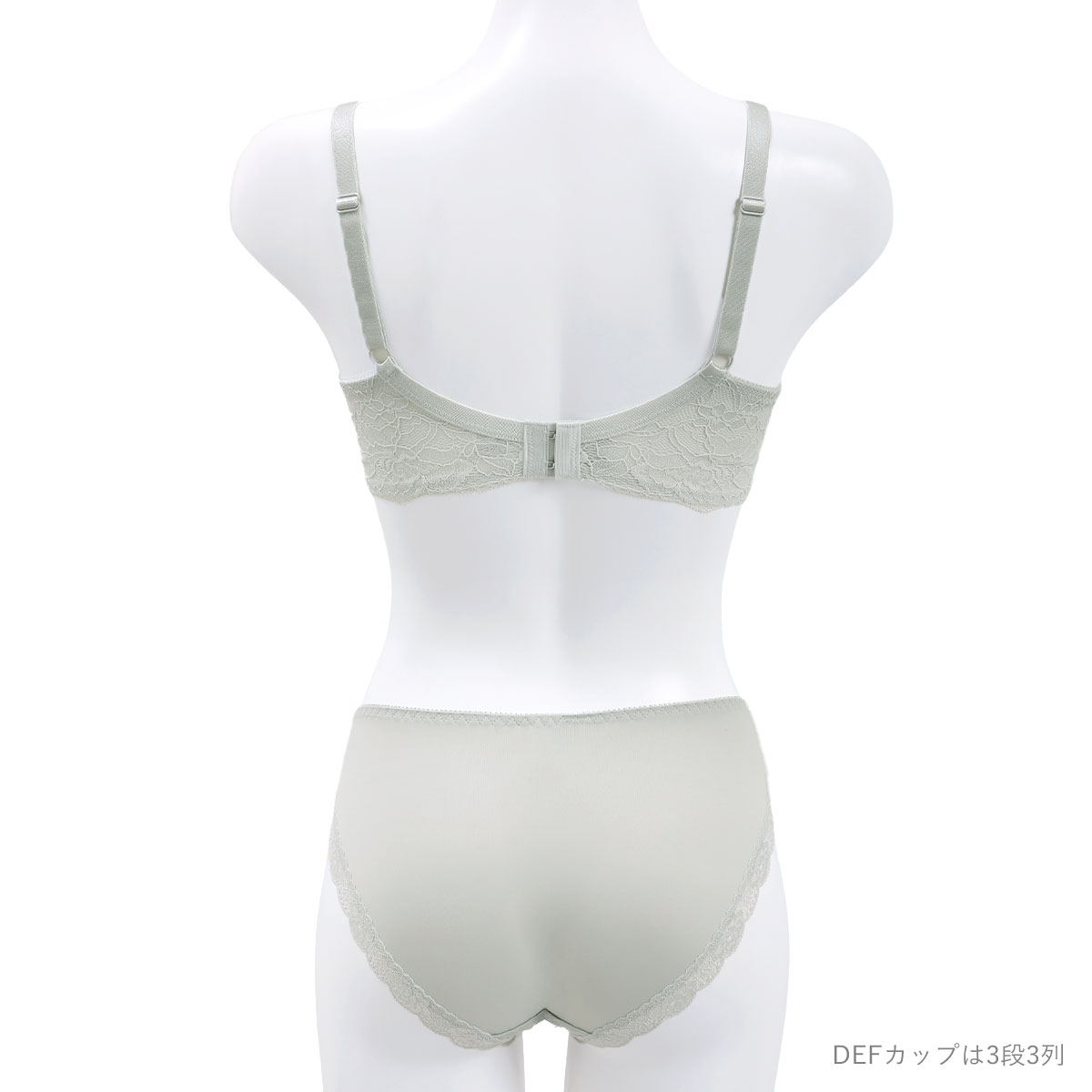 | 仕 様 | 【ブラ】 ・ホックの数:2段3列(DEFカップは3段3列) ・3/4カップ ・パッド取外し:可能 ・肩紐取外し:不可 ・ワイヤー入り ・サイドボーン:あり ・脇高設計 ※アクセサリーは取り外しできません。