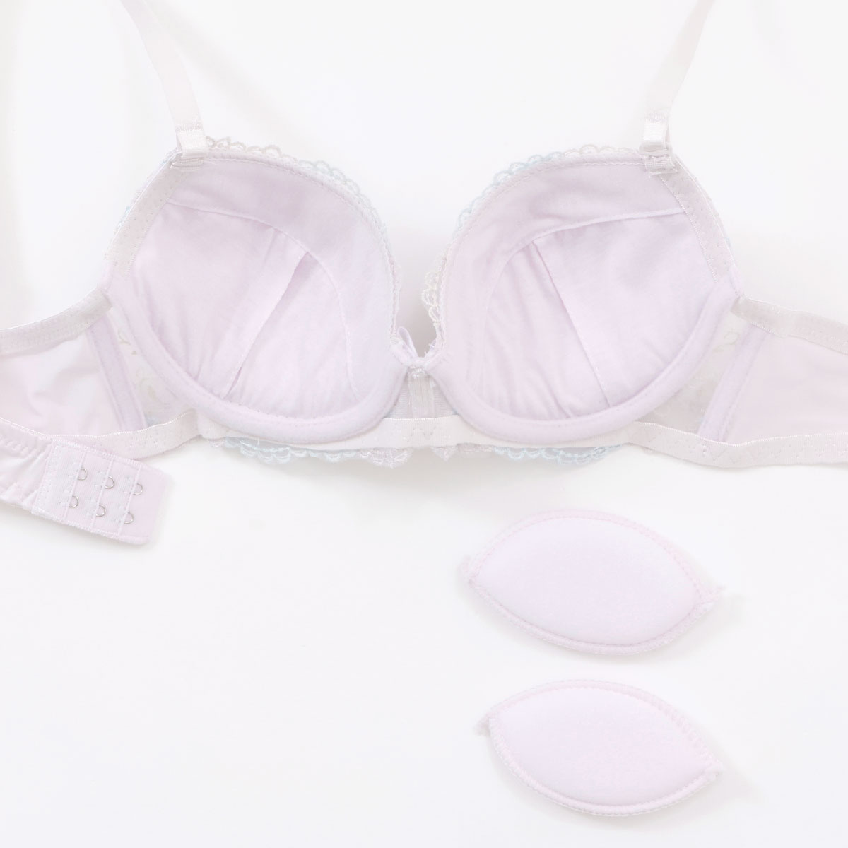 ブラジャーのカップにはモールドカップを採用し、自然なまるみのあるバストシルエットに。カップ裏は下厚の内蔵パッドと取り外し可能なふわふわレモンパッドのWパッド仕様で、ふっくらボリュームのあるバストをメイクします。