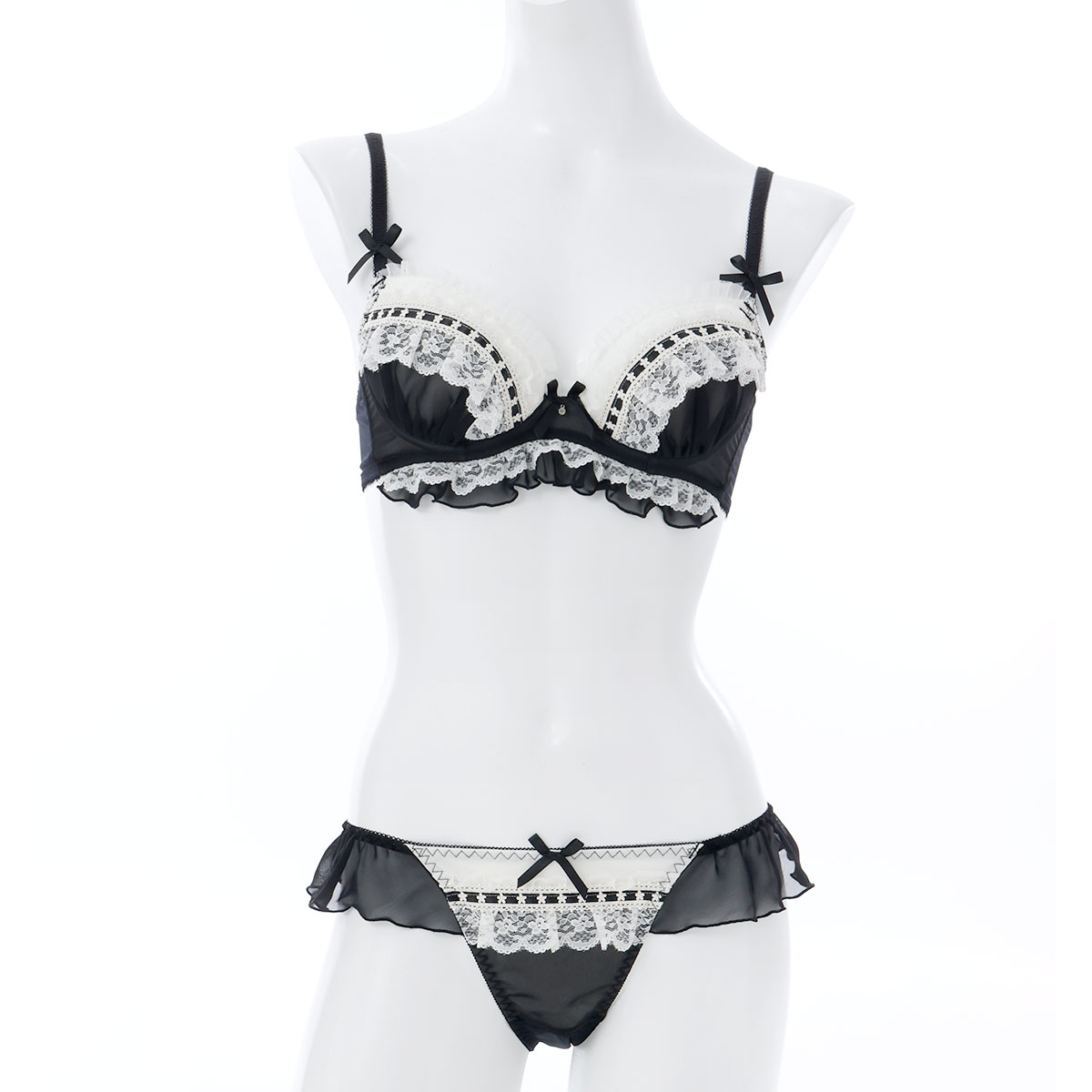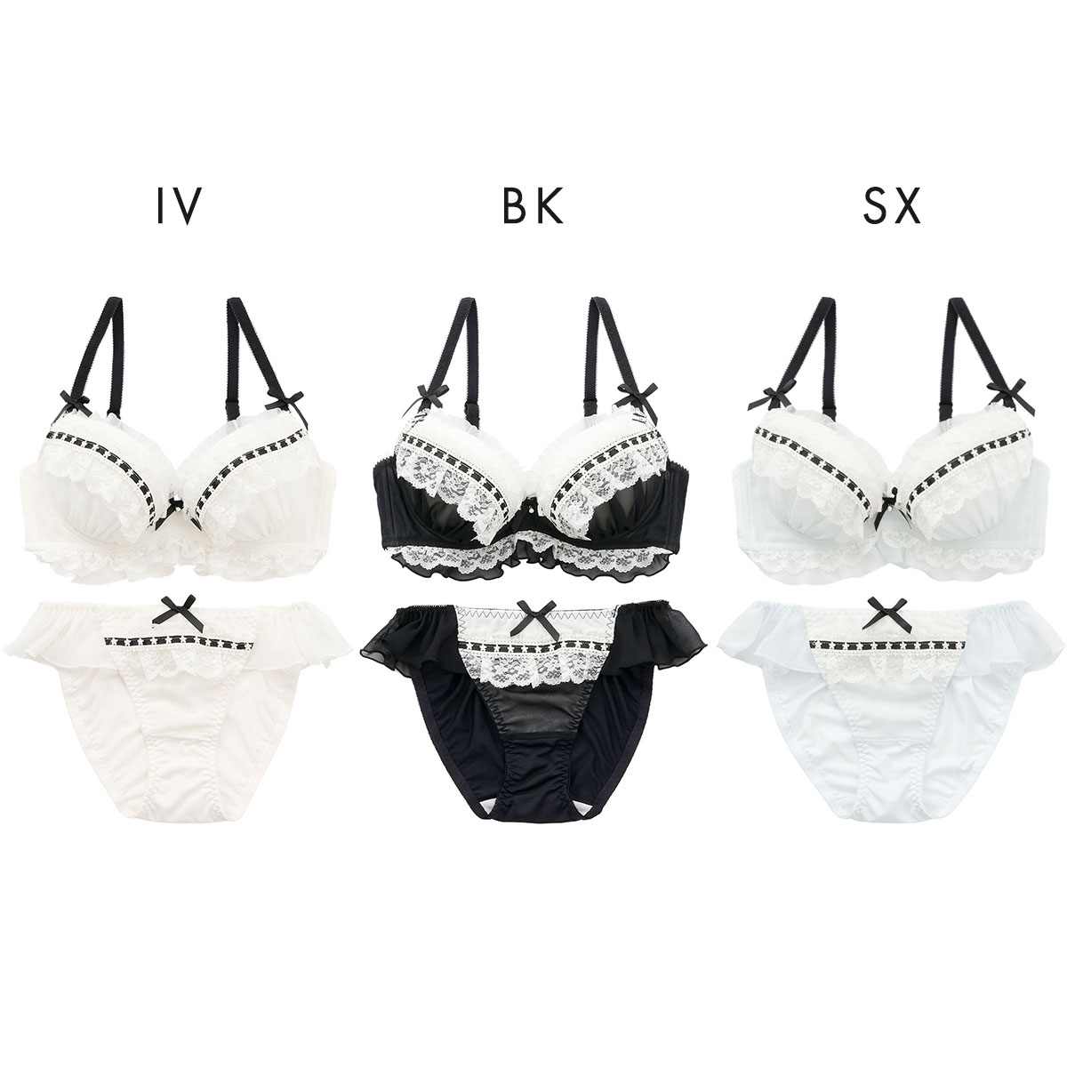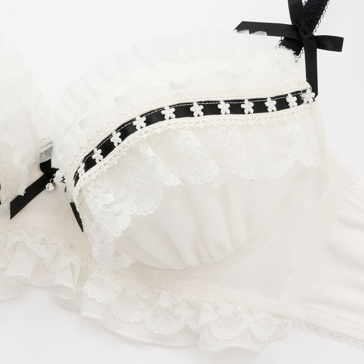 レースやリボン、フリル感をふんだんにあしらい、ジェラートのように甘くて可愛らしい雰囲気に仕上げたブラ&ショーツセット☆ストラップなどにあしらったブラックのリボンが乙女心くすぐるキュートなアクセントになっています。