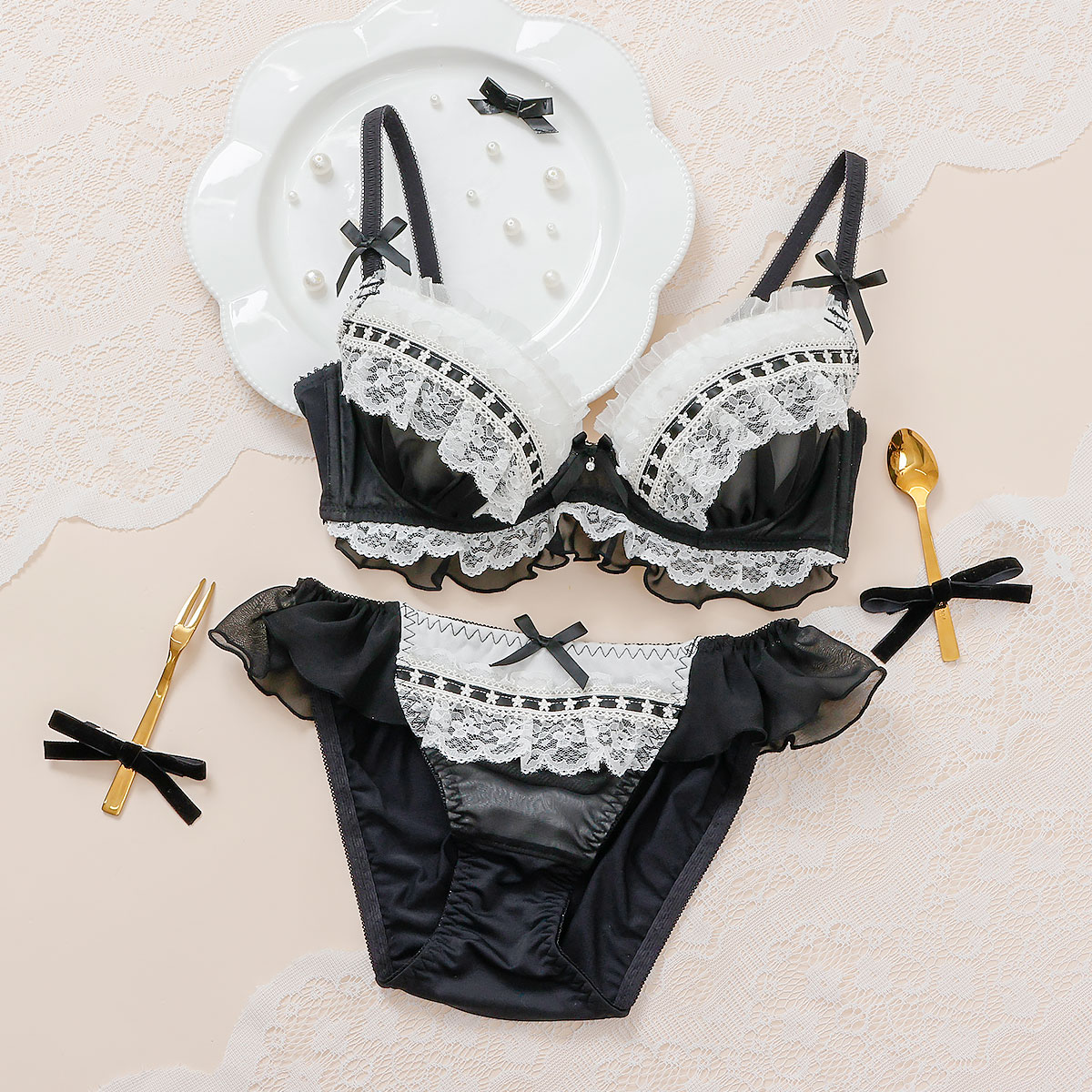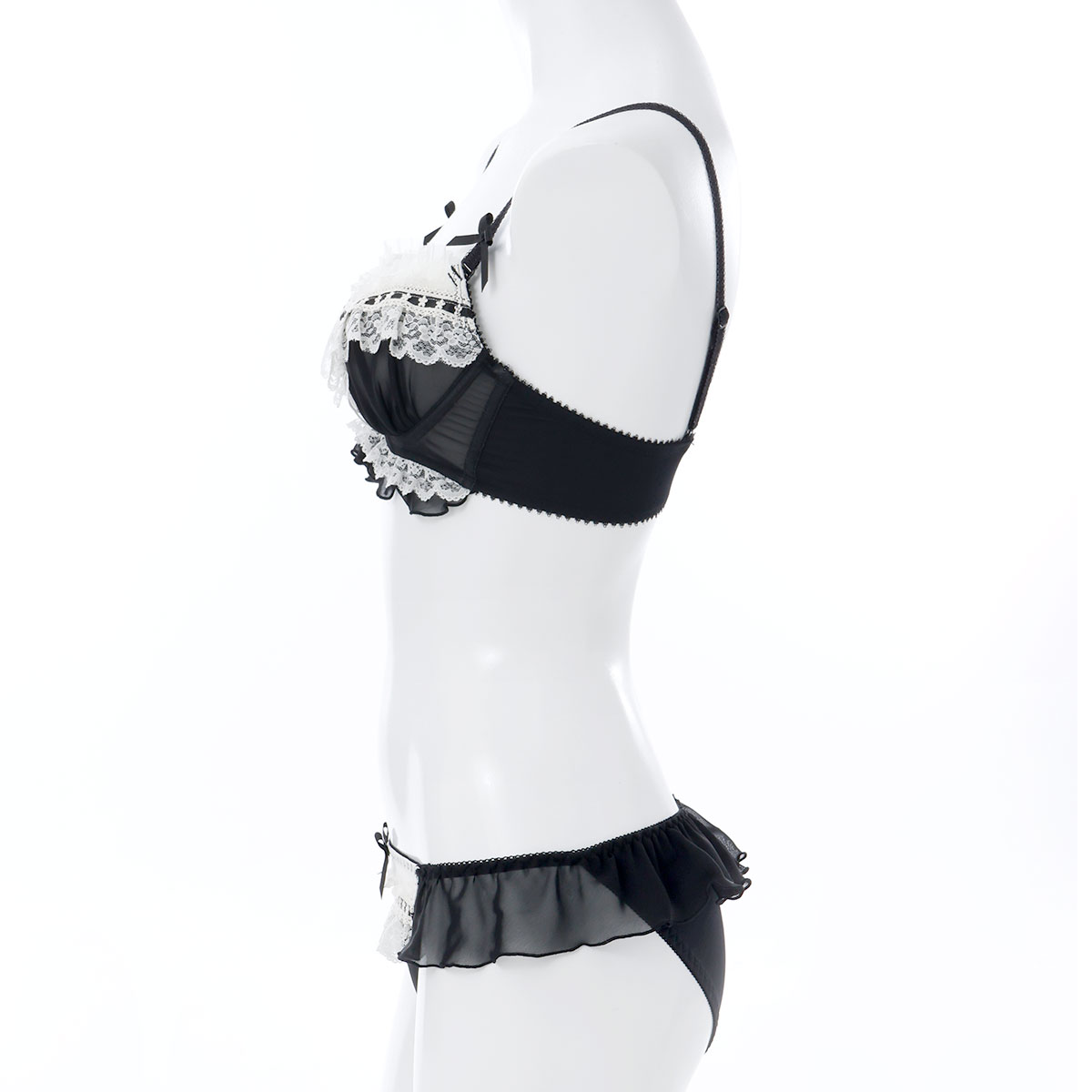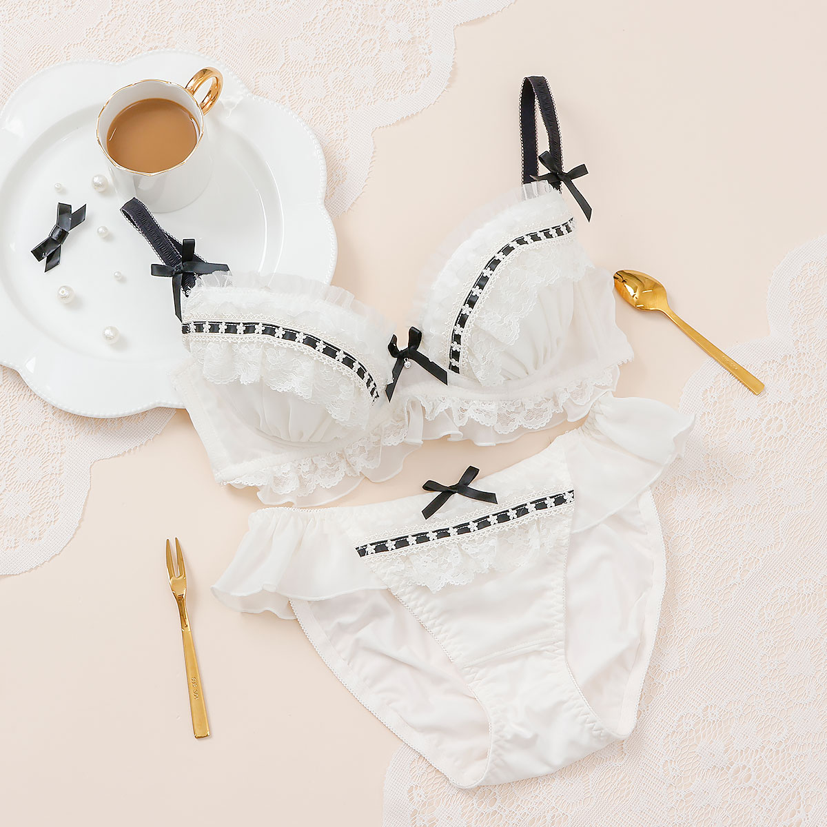 レースやリボン、フリル感をふんだんにあしらい、ジェラートのように甘くて可愛らしい雰囲気に仕上げたブラ&ショーツセット☆ストラップなどにあしらったブラックのリボンが乙女心くすぐるキュートなアクセントになっています。