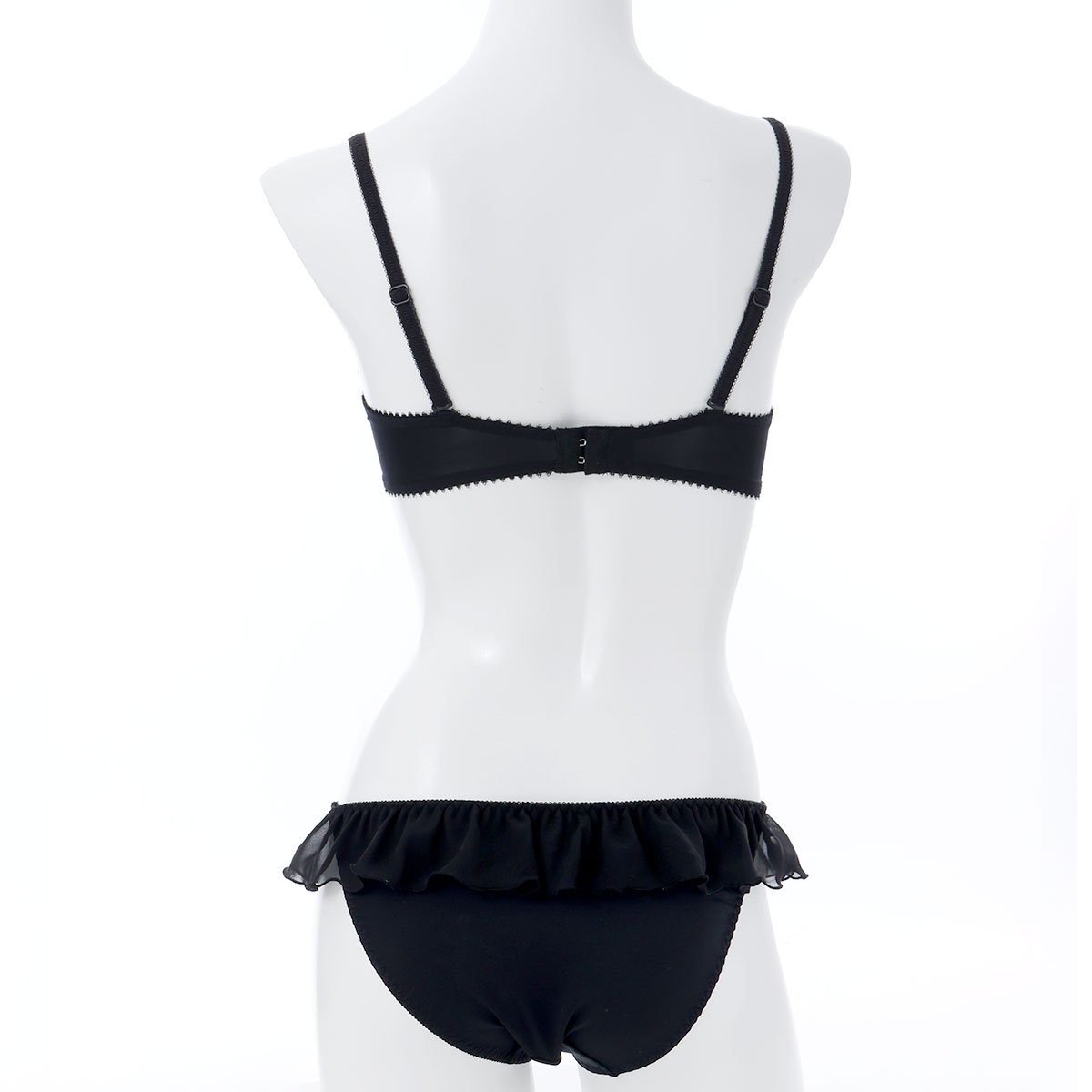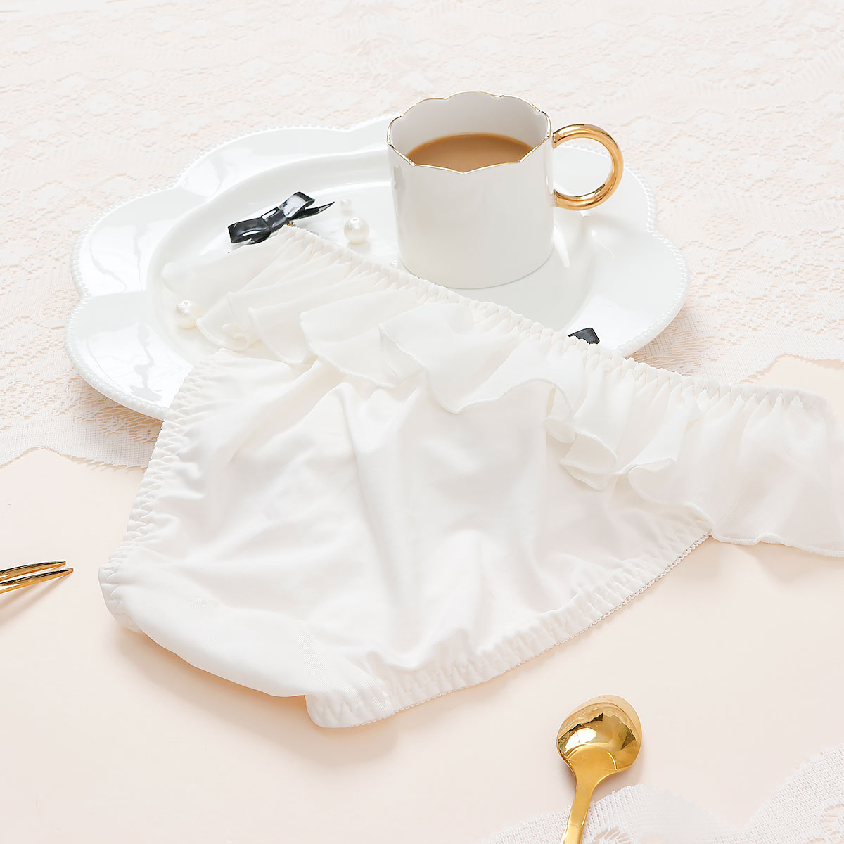 セットショーツはデイリー使いにおすすめのスタンダードタイプ。後ろまでシフォンフリルをたっぷりほどこし甘々に仕上げています♪バック身生地はタテヨコに伸縮性があり、心地よいフィット感です。