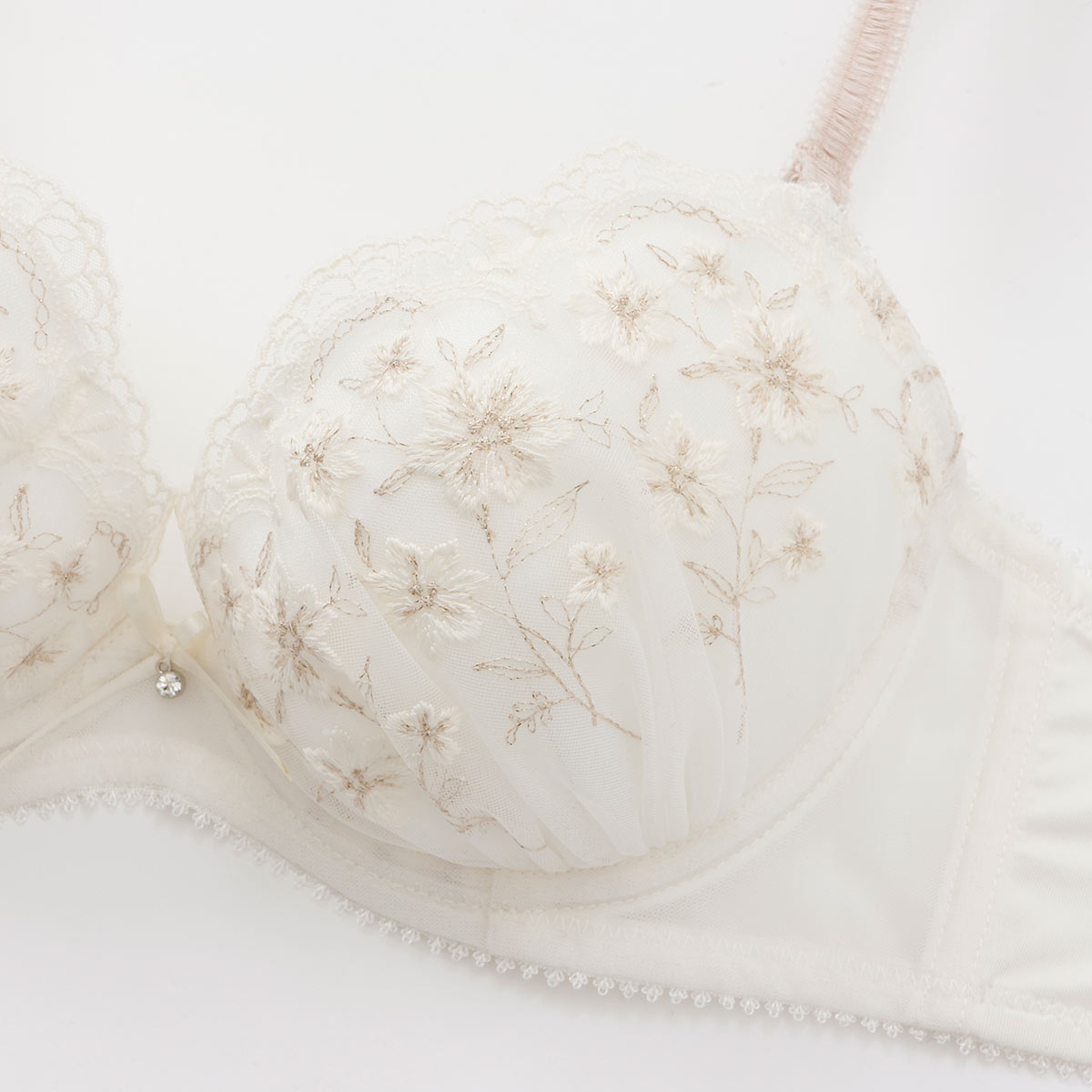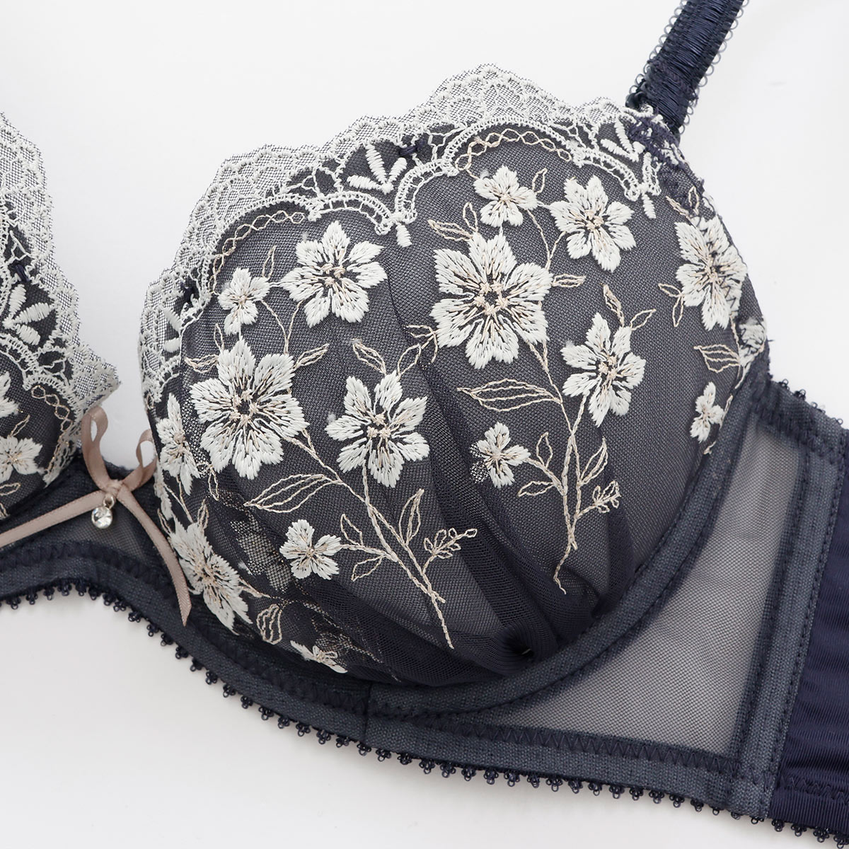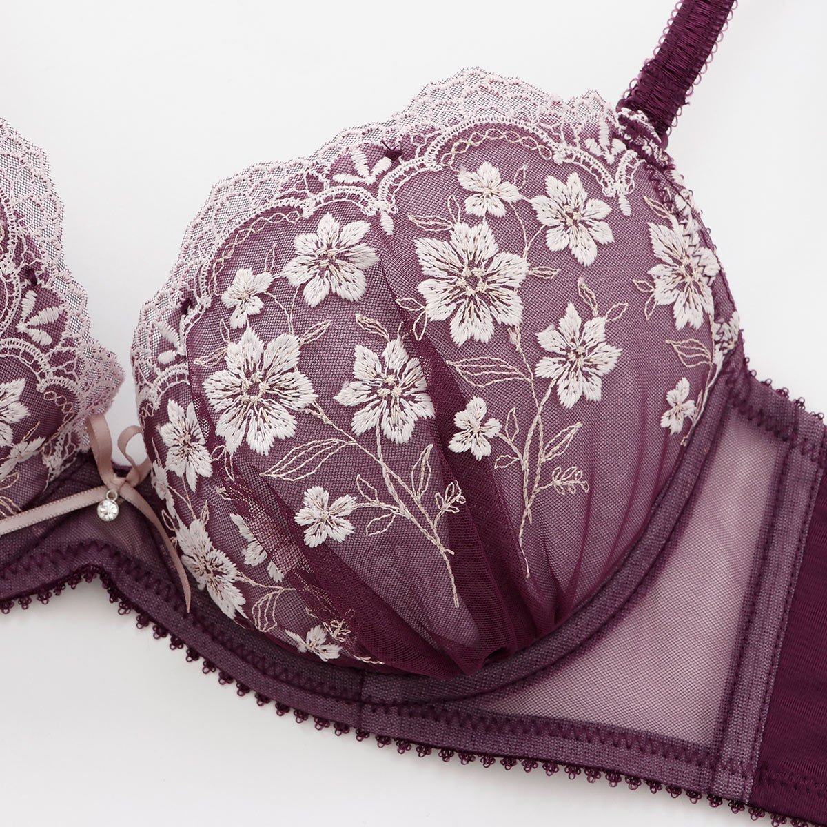 優雅に咲く花々を思わせる刺しゅうに、ほんのり輝くラメ糸を散りばめて。クラシカルなムードが漂う大人なブラセット。