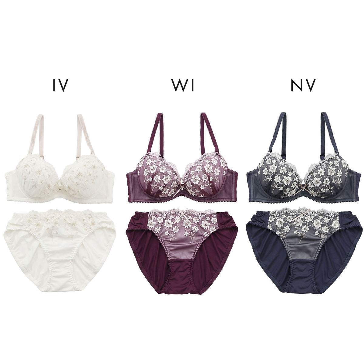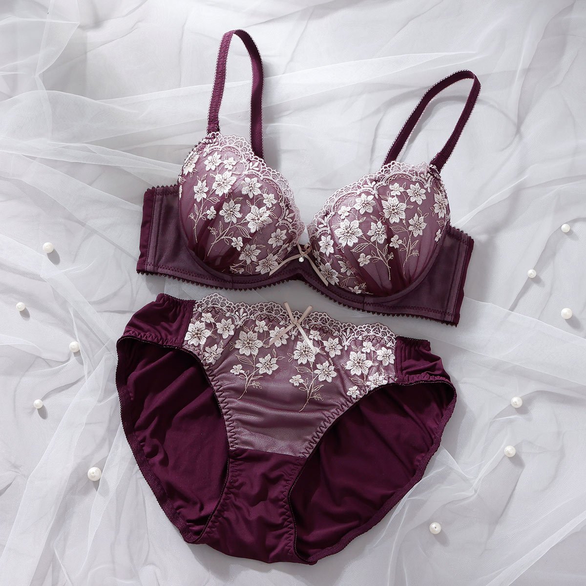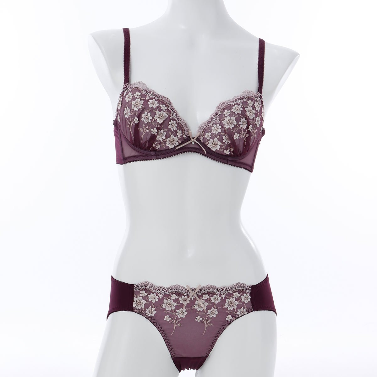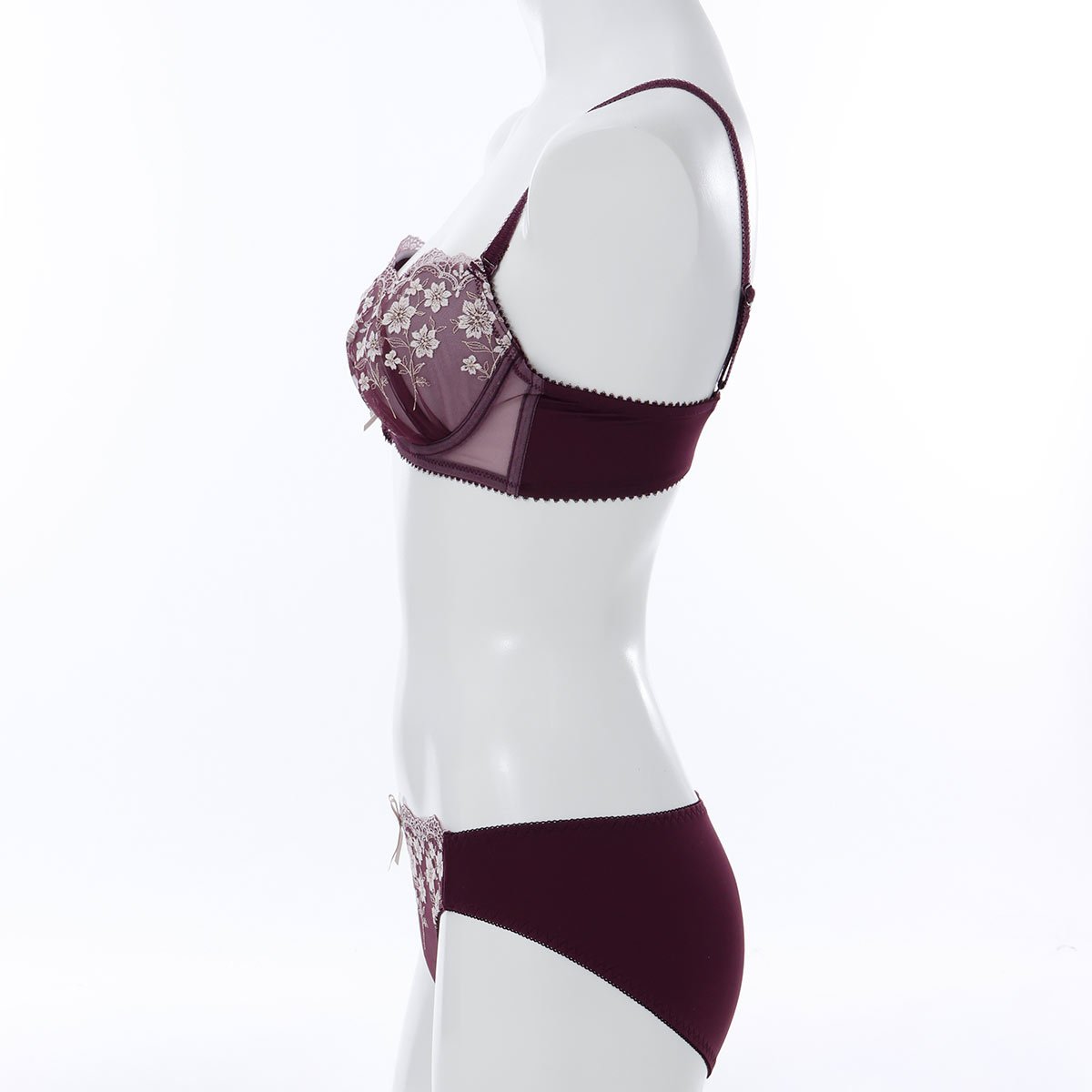 優雅に咲く花々を思わせる刺しゅうに、ほんのり輝くラメ糸を散りばめて。クラシカルなムードが漂う大人なブラセット。