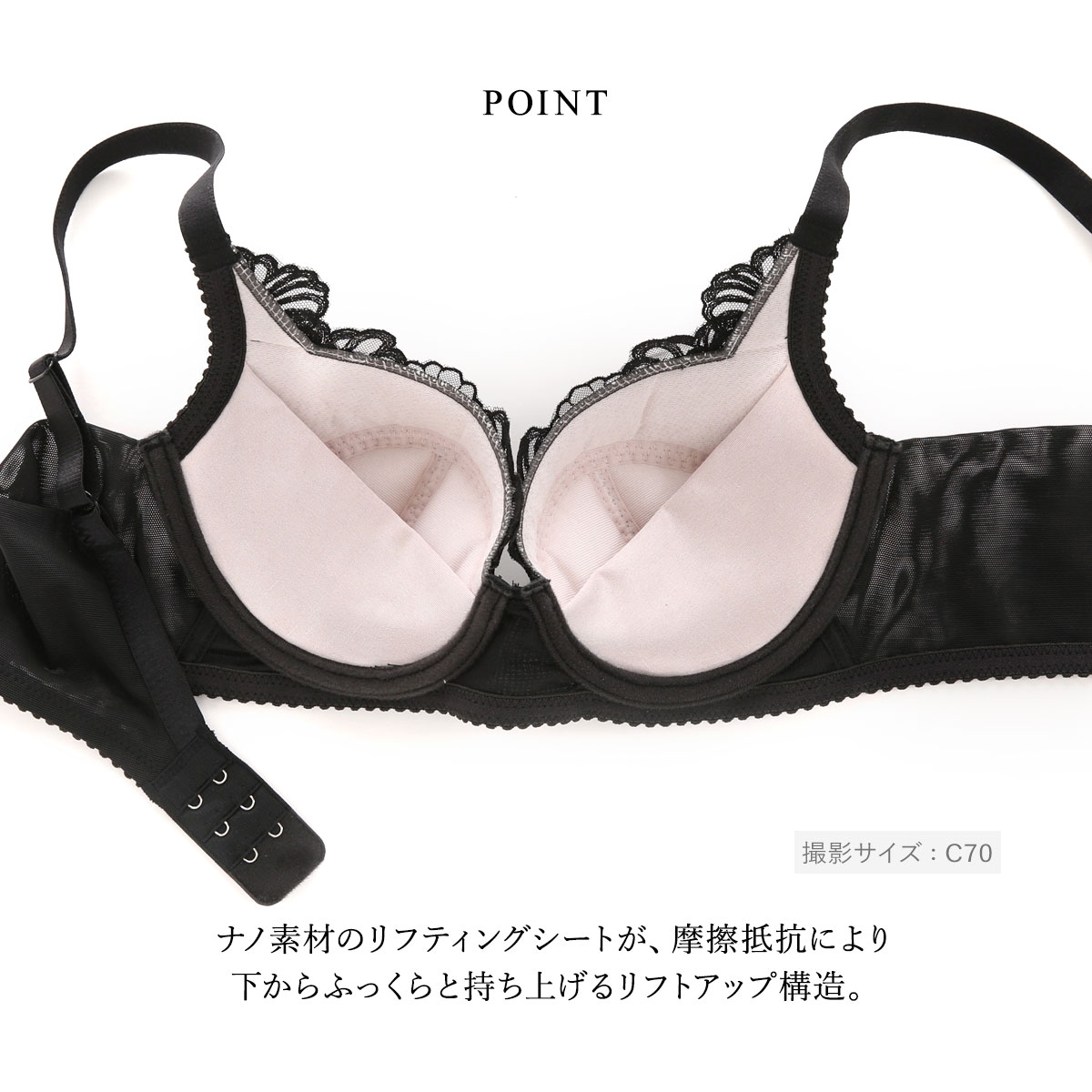 カップ裏に配したナノ素材のリフティングシートで胸を下から持ち上げ、まるくてきれいなバストシルエットとふっくらデコルテをメイク。ナノ素材の摩擦抵抗により、動いたときのブラの着くずれを防止し、ふっくらバストときれいなデコルテをキープします。