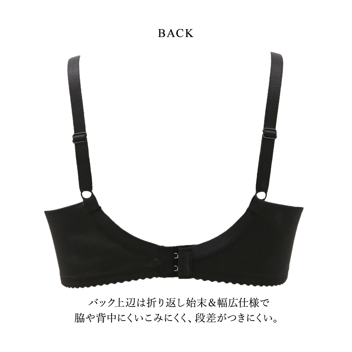 アンダーとカップ脇上辺は伸びのよい肌側綿混ストレッチテープを使用した、優しい肌あたり。バック上辺は折り返し始末で肌にくいこみにくく、段差が付きにくいので、バックスタイルもすっきり。