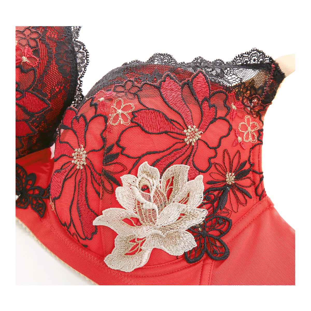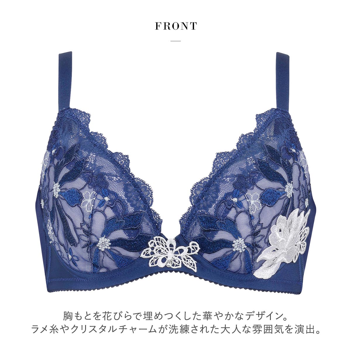 胸もとを花びらで埋めつくした華やかなデザイン。ラメ糸や前中心のクリスタルチャームが洗練された大人な雰囲気を演出。