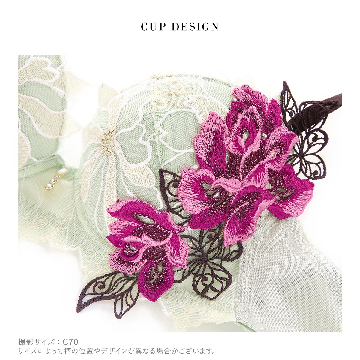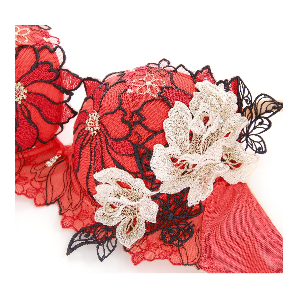 胸もとを花びらで埋めつくした華やかなデザイン。インパクトのあるアップリケはバラの花をイメージ。ラメ糸や前中心のクリスタルチャームが洗練された大人な雰囲気を演出。