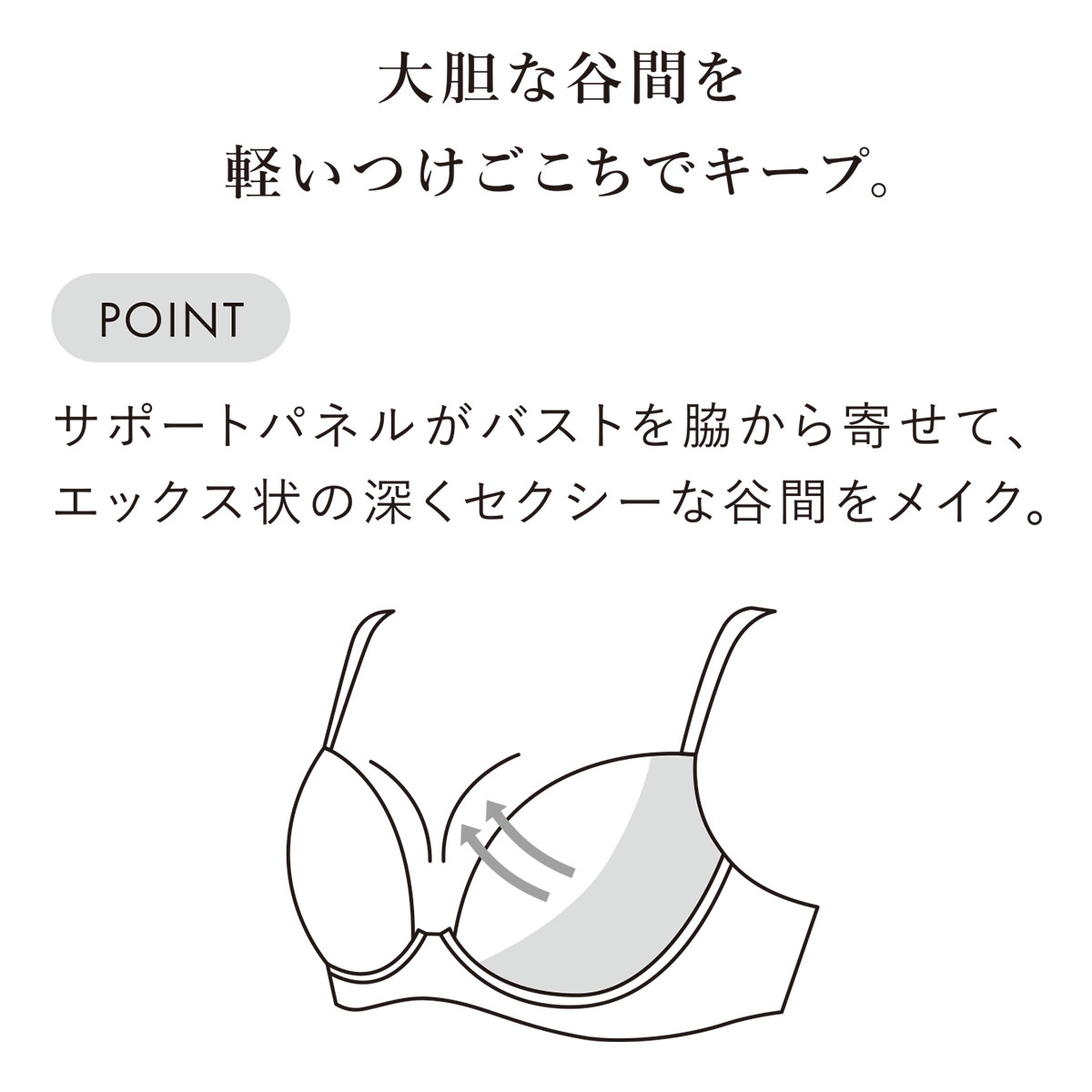 サポートパネルがバストを脇から寄せて、エックス状の深くセクシーな谷間をメイクします。